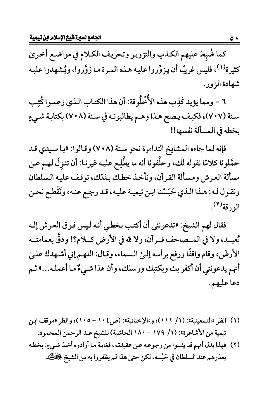 فإنه لما جاءه المشايخ التدامرة نحو سنة (٧٠٨) وقالوا: «يا سيدي قد حمَّلونا كلامًا نقوله لك، وحلَّفونا أنه ما يطَّلِع عليه غيرنا: أن تنزِلَ لهم عن مسألة العرش ومسألة القرآن، ونأخذ خطك بذلك، نوقف عليه السلطان ونقول له: هذا الذي حَبَسْنا ابن تيمية عليه، قد رجع عنه، ونَقْطع نحن الورقة (¬٢).