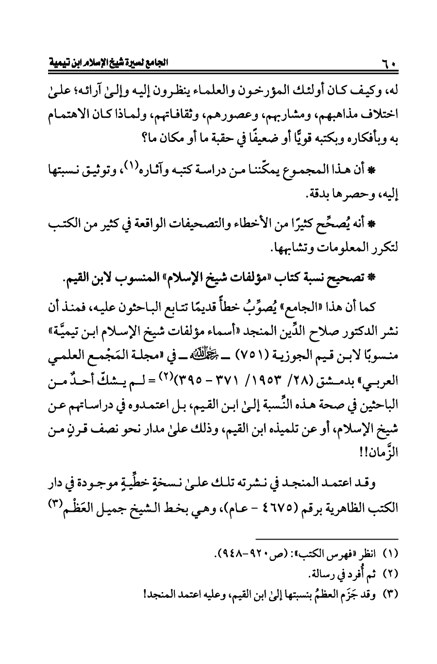 كما أن هذا «الجامع» يُصوِّبُ خطأً قديمًا تتابع الباحثون عليه، فمنذ أن نشر الدكتور صلاح الدِّين المنجد «أسماء مؤلفات شيخ الإسلام ابن تيميَّة» منسوبًا لابن قيم الجوزية (٧٥١) - رحمه الله - في «مجلة المَجْمع العلمي العربي» بدمشق (٢٨/ ١٩٥٣/ ٣٧١ - ٣٩٥) (¬٢) = لم يشكّ أحدٌ من الباحثين في صحة هذه النِّسبة إلى ابن القيم، بل اعتمدوه في دراساتهم عن شيخ الإسلام، أو عن تلميذه ابن القيم، وذلك على مدار نحو نصف قرنٍ من الزَّمان!!