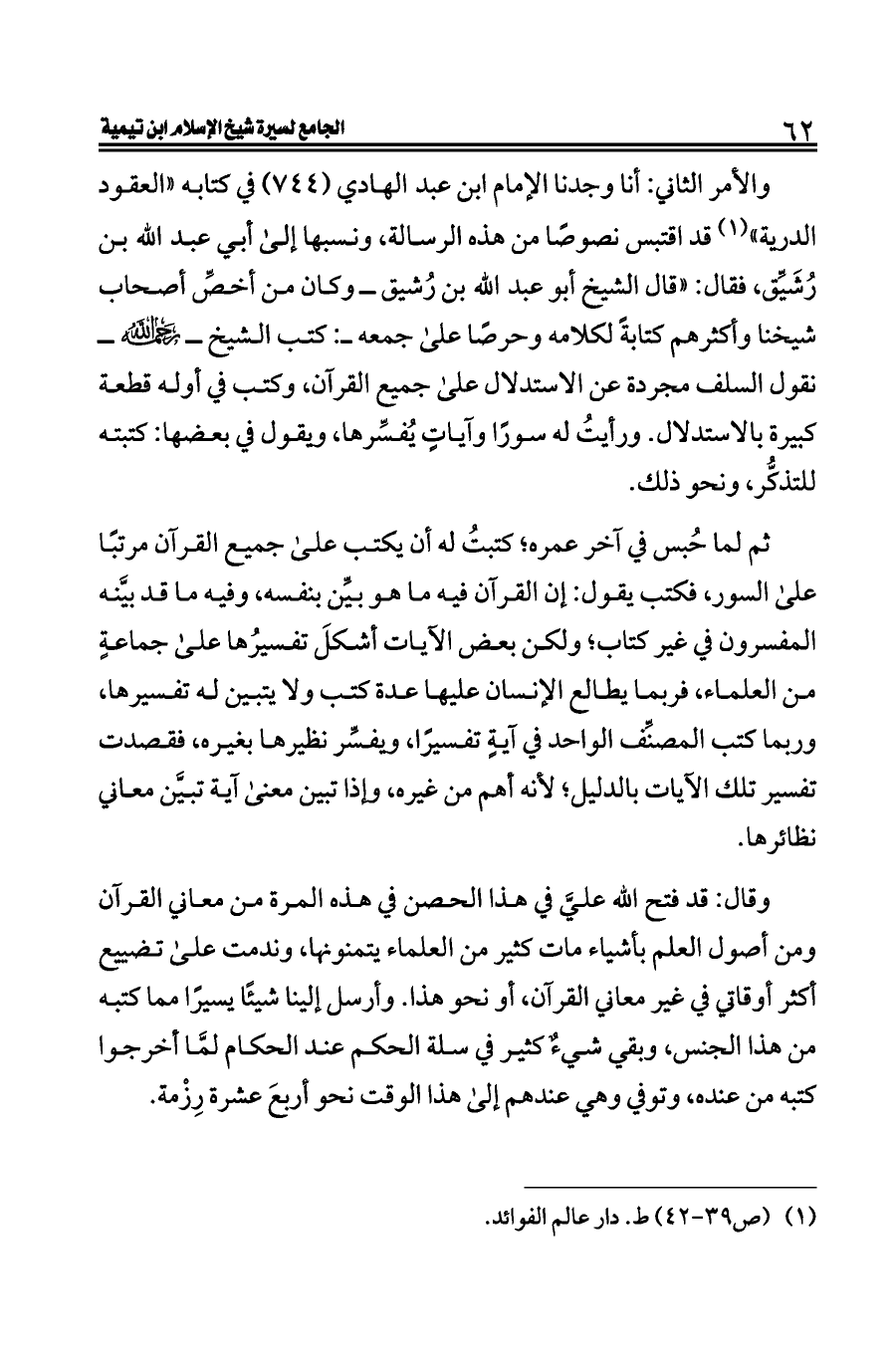 والأمر الثاني: أنا وجدنا الإمام ابن عبد الهادي (٧٤٤) في كتابه «العقود الدرية» (¬١) قد اقتبس نصوصًا من هذه الرسالة، ونسبها إلى أبي عبد الله بن رُشَيِّق، فقال: «قال الشيخ أبو عبد الله بن رُشيق ــ وكان من أخصِّ أصحاب شيخنا وأكثرهم كتابةً لكلامه وحرصًا على جمعه ــ: كتب الشيخ - رحمه الله - نقول السلف مجردة عن الاستدلال على جميع القرآن، وكتب في أوله قطعة كبيرة بالاستدلال. ورأيتُ له سورًا وآياتٍ يُفسِّرها، ويقول في بعضها: كتبته للتذكُّر، ونحو ذلك.