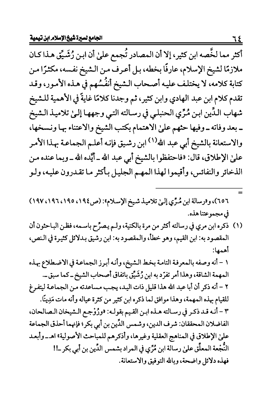 أكثر مما لخَّصه ابن كثير، إلا أن المصادر تُجمع على أن ابن رُشَيِّق هذا كان ملازمًا لشيخ الإسلام، عارفًا بخطه، بل أعرف من الشيخ نفسه، مكثرًا من كتابة كلامه، لا يختلف عليه أصحاب الشيخ أنفُسُهم في هذه الأمور, وقد تقدم كلام ابن عبد الهادي وابن كثير، ثم وجدنا كلامًا غايةً في الأهمية للشيخ شهاب الدِّين ابن مُرِّي الحنبلي في رسالته التي وجهها إلى تلاميذ الشيخ ــ بعد وفاته ــ وفيها حثهم على الاهتمام بكتب الشيخ والاعتناء بها ونسخها، والاستعانة بالشيخ أبي عبد الله (¬١)