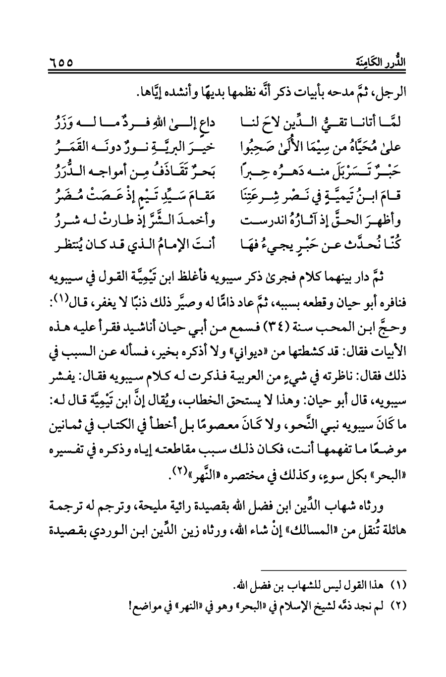 ثمَّ دار بينهما كلام فجرى ذكر سيبويه فأغلظ ابن تَيْمِيَّة القول في سيبويه فنافره أبو حيان وقطعه بسببه، ثمَّ عاد ذامًّا له وصيَّر ذلك ذنبًا لا يغفر، قال (¬١): وحجَّ ابن المحب سنة (٣٤) فسمع من أبي حيان أناشيد فقرأ عليه هذه الأبيات فقال: قد كشطتها من «ديواني» ولا أذكره بخير، فسأله عن السبب في ذلك فقال: ناظرته في شيءٍ من العربية فذكرت له كلام سيبويه فقال: يفشر سيبويه، قال أبو حيان: وهذا لا يستحق الخطاب، ويُقال إنَّ ابن تَيْمِيَّة قال له: ما كَانَ سيبويه نبي النَّحو، ولا كَانَ معصومًا بل أخطأ في الكتاب في ثمانين موضعًا ما تفهمها أنت، فكان ذلك سبب مقاطعته إياه وذكره في تفسيره «البحر» بكل سوءٍ، وكذلك في مختصره «النَّهر» (¬٢).