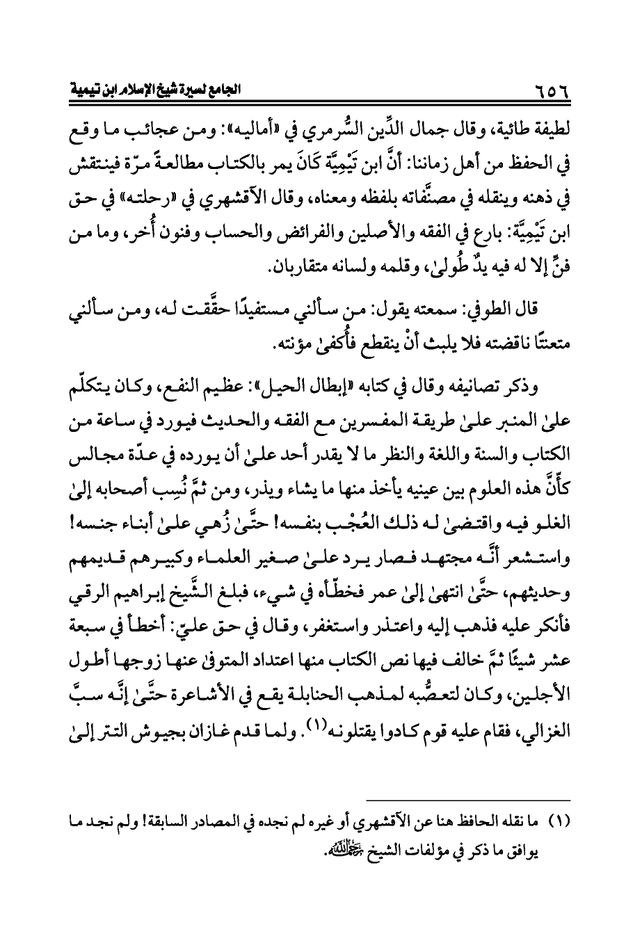 لطيفة طائية، وقال جمال الدِّين السُّرمري في «أماليه»: ومن عجائب ما وقع في الحفظ من أهل زماننا: أنَّ ابن تَيْمِيَّة كَانَ يمر بالكتاب مطالعةً مرّة فينتقش في ذهنه وينقله في مصنَّفاته بلفظه ومعناه، وقال الآقشهري في «رحلته» في حق ابن تَيْمِيَّة: بارع في الفقه والأصلين والفرائض والحساب وفنون أُخر، وما من فنِّ إلا له فيه يدٌ طُولى، وقلمه ولسانه متقاربان.