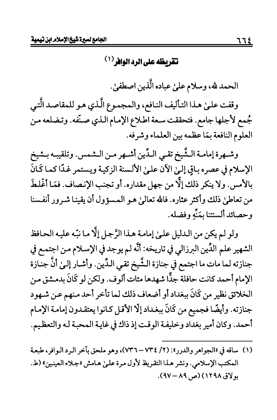 (¬١) ساقه في «الجواهر والدرر»: (٢/ ٧٣٤ - ٧٣٦)، وهو ملحق بآخر الرد الوافر، طبعة المكتب الإسلامي. ونشر هذا التقريظ لأول مرة على هامش «جلاء العينين» (ط. بولاق ١٢٩٨) (ص ٨٩ - ٩٧).