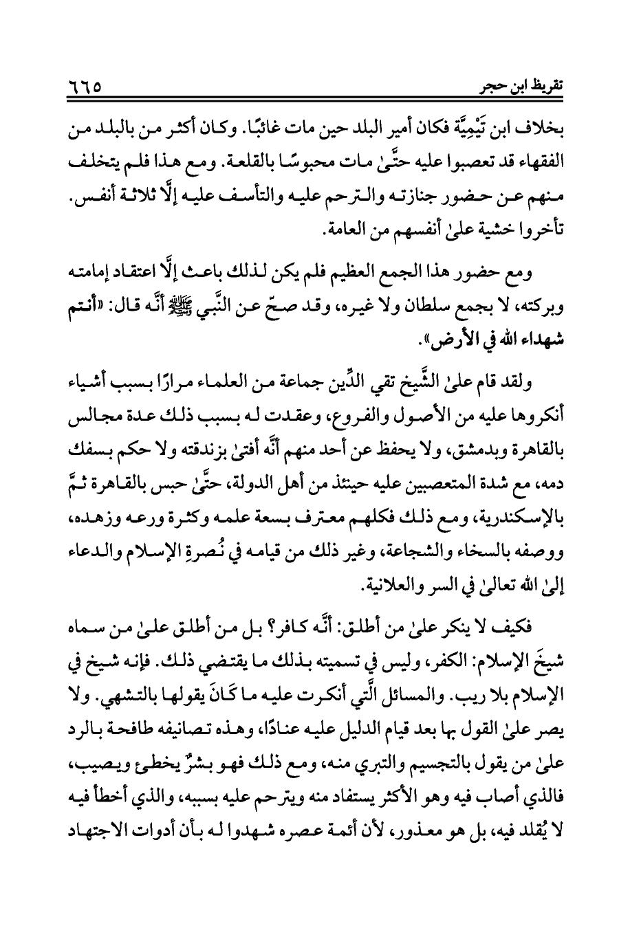 ولقد قام على الشَّيخ تقي الدِّين جماعة من العلماء مرارًا بسبب أشياء أنكروها عليه من الأصول والفروع، وعقدت له بسبب ذلك عدة مجالس بالقاهرة وبدمشق، ولا يحفظ عن أحد منهم أنَّه أفتى بزندقته ولا حكم بسفك دمه، مع شدة المتعصبين عليه حينئذ من أهل الدولة، حتَّى حبس بالقاهرة ثمَّ بالإسكندرية، ومع ذلك فكلهم معترف بسعة علمه وكثرة ورعه وزهده، ووصفه بالسخاء والشجاعة، وغير ذلك من قيامه في نُصرةِ الإسلام والدعاء إلى الله تعالى في السر والعلانية.