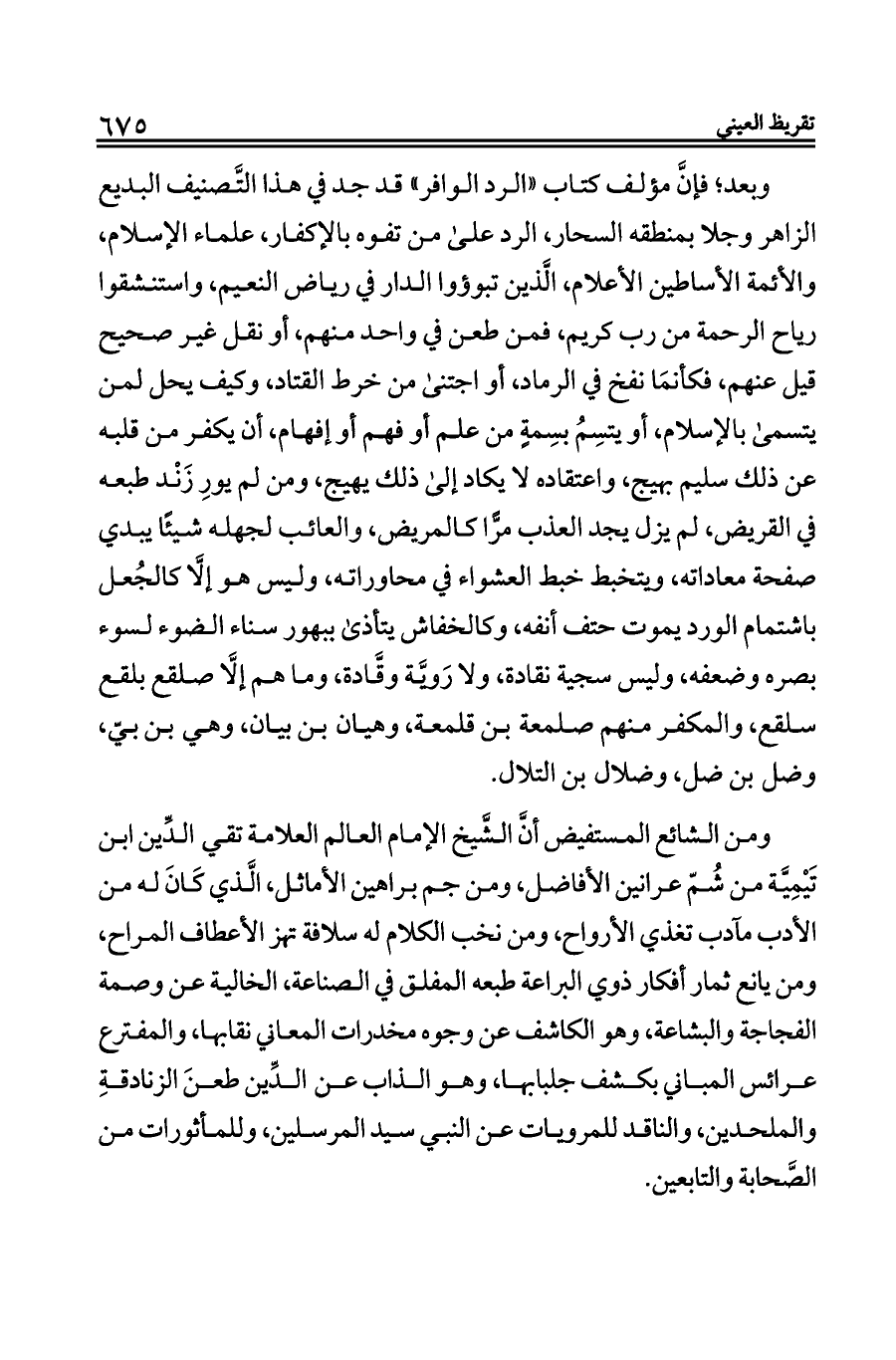 وبعد؛ فإنَّ مؤلف كتاب «الرد الوافر» قد جد في هذا التَّصنيف البديع الزاهر وجلا بمنطقه السحار، الرد على من تفوه بالإكفار، علماء الإسلام، والأئمة الأساطين الأعلام، الَّذين تبوؤوا الدار في رياض النعيم، واستنشقوا رياح الرحمة من رب كريم، فمن طعن في واحد منهم، أو نقل غير صحيح قيل عنهم، فكأنمَا نفخ في الرماد، أو اجتنى من خرط القتاد، وكيف يحل لمن يتسمى بالإسلام، أو يتسِمُ بسِمةٍ من علم أو فهم أو إفهام، أن يكفر من قلبه عن ذلك سليم بهيج، واعتقاده لا يكاد إلى ذلك يهيج، ومن لم يورِ زَنْد طبعه في القريض، لم يزل يجد العذب مرًّا كالمريض، والعائب لجهله شيئًا يبدي صفحة معاداته، ويتخبط خبط العشواء في محاوراته، وليس هو إلَّا كالجُعل باشتمام الورد يموت حتف أنفه، وكالخفاش يتأذى ببهور سناء الضوء لسوء بصره وضعفه، وليس سجية نقادة، ولا رَويَّة وقَّادة، وما هم إلَّا صلقع بلقع سلقع، والمكفر منهم صلمعة بن قلمعة، وهيان بن بيان، وهي بن بيّ، وضل بن ضل، وضلال بن التلال.