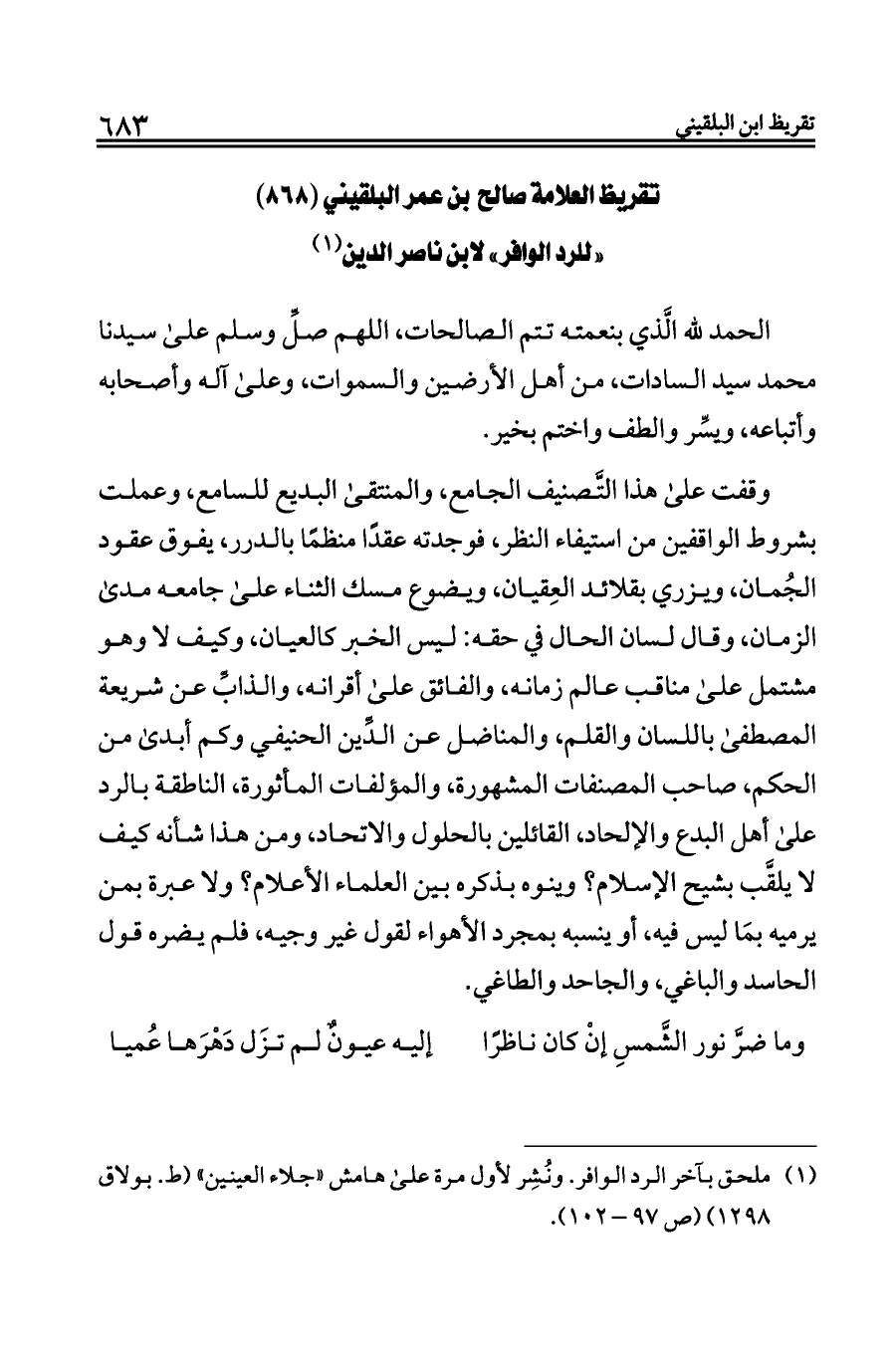 (¬١) ملحق بآخر الرد الوافر. ونُشِر لأول مرة على هامش «جلاء العينين» (ط. بولاق ١٢٩٨) (ص ٩٧ - ١٠٢).