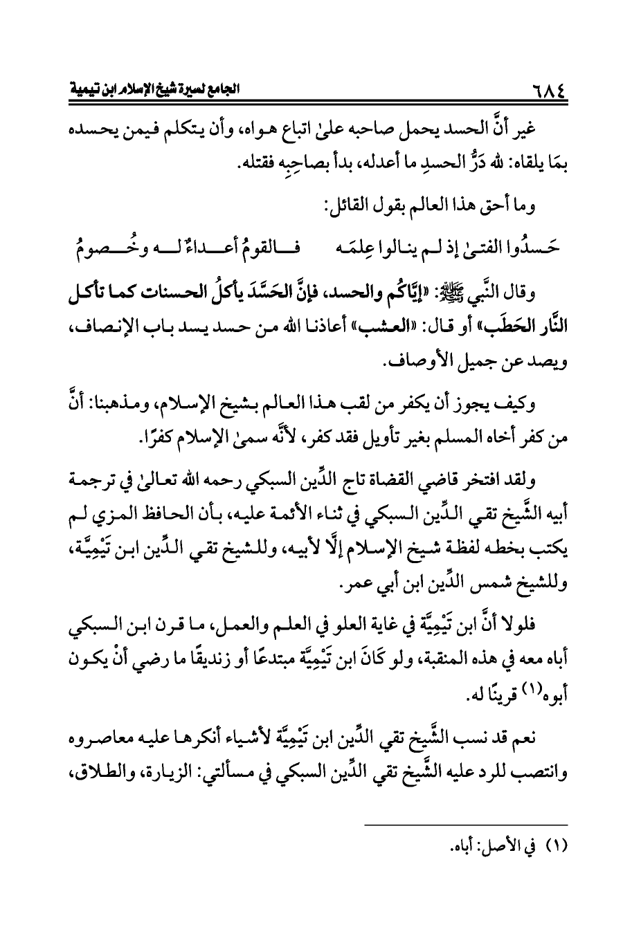 فلولا أنَّ ابن تَيْمِيَّة في غاية العلو في العلم والعمل، ما قرن ابن السبكي أباه معه في هذه المنقبة، ولو كَانَ ابن تَيْمِيَّة مبتدعًا أو زنديقًا ما رضي أنْ يكون أبوه (¬١) قرينًا له.