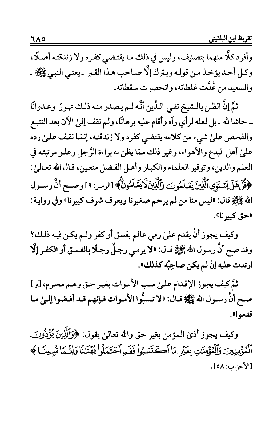 ثمَّ إنَّ الظن بالشيخ تقي الدِّين أنَّه لم يصدر منه ذلك تهورًا وعدوانًا ــ حاشا لله ـ بل لعله لرأي رآه وأقام عليه برهانًا، ولم نقف إلى الآن بعد التتبع والفحص على شيء من كلامه يقتضي كفره ولا زندقته، إنمَا نقف على رده على أهل البدع والأهواء، وغير ذلك ممَا يظن به براءة الرَّجل وعلو مرتبته في العلم والدين، وتوقير العلماء والكبار وأهل الفضل متعين، قال الله تعالى: {قُلْ هَلْ يَسْتَوِي الَّذِينَ يَعْلَمُونَ وَالَّذِينَ لَا يَعْلَمُونَ} [الزمر: ٩] وصح أنَّ رسول الله - صلى الله عليه وسلم - قال: «ليس منا من لم يرحم صغيرنا ويعرف شرف كبيرنا» وفي رواية: «حق كبيرنا».