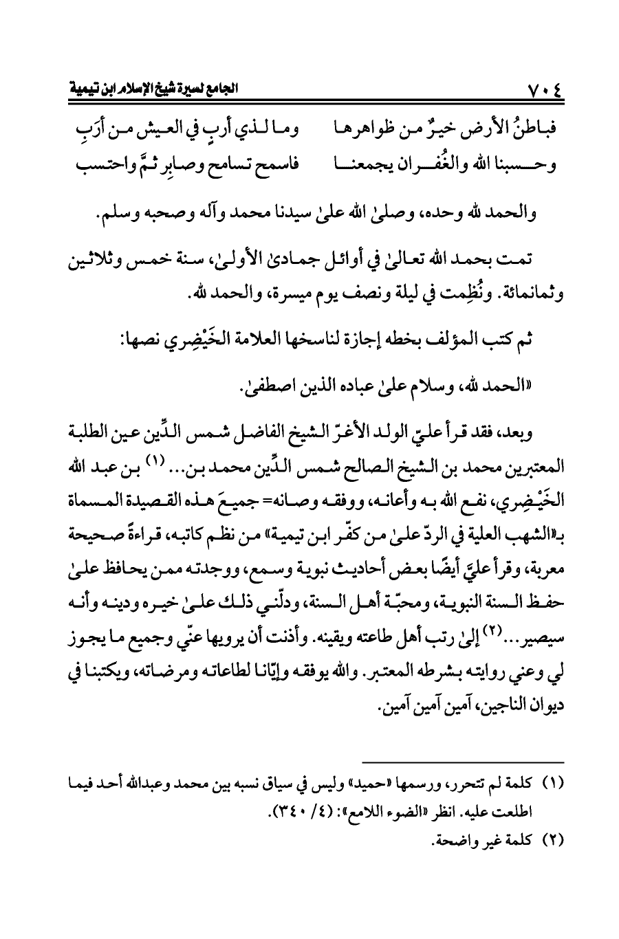 وبعد، فقد قرأ عليّ الولد الأغرّ الشيخ الفاضل شمس الدِّين عين الطلبة المعتبرين محمد بن الشيخ الصالح شمس الدِّين محمد بن ... (¬١) بن عبد الله الخَيْضِري، نفع الله به وأعانه، ووفقه وصانه= جميعَ هذه القصيدة المسماة بـ «الشهب العلية في الردّ على من كفّر ابن تيمية» من نظم كاتبه، قراءةً صحيحة معربة، وقرأ عليَّ أيضًا بعض أحاديث نبوية وسمع، ووجدته ممن يحافظ على حفظ السنة النبوية، ومحبّة أهل السنة، ودلّني ذلك على خيره ودينه وأنه سيصير ... (¬٢) إلى رتب أهل طاعته ويقينه. وأذنت أن يرويها عنّي وجميع ما يجوز لي وعني روايته بشرطه المعتبر. والله يوفقه وإيّانا لطاعاته ومرضاته، ويكتبنا في ديوان الناجين، آمين آمين آمين.