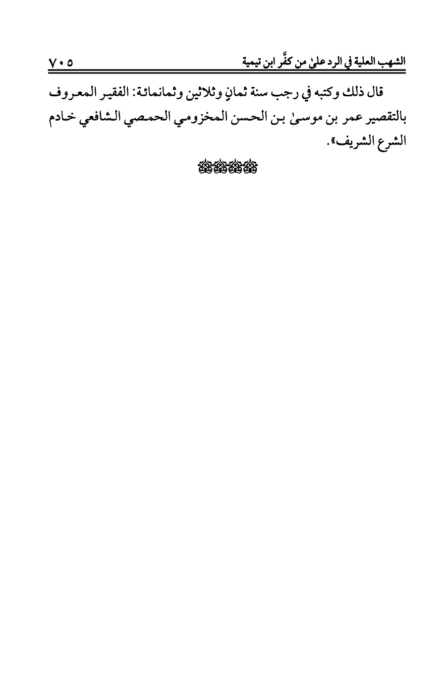 قال ذلك وكتبه في رجب سنة ثمانٍ وثلاثين وثمانمائة: الفقير المعروف بالتقصير عمر بن موسى بن الحسن المخزومي الحمصي الشافعي خادم الشرع الشريف».