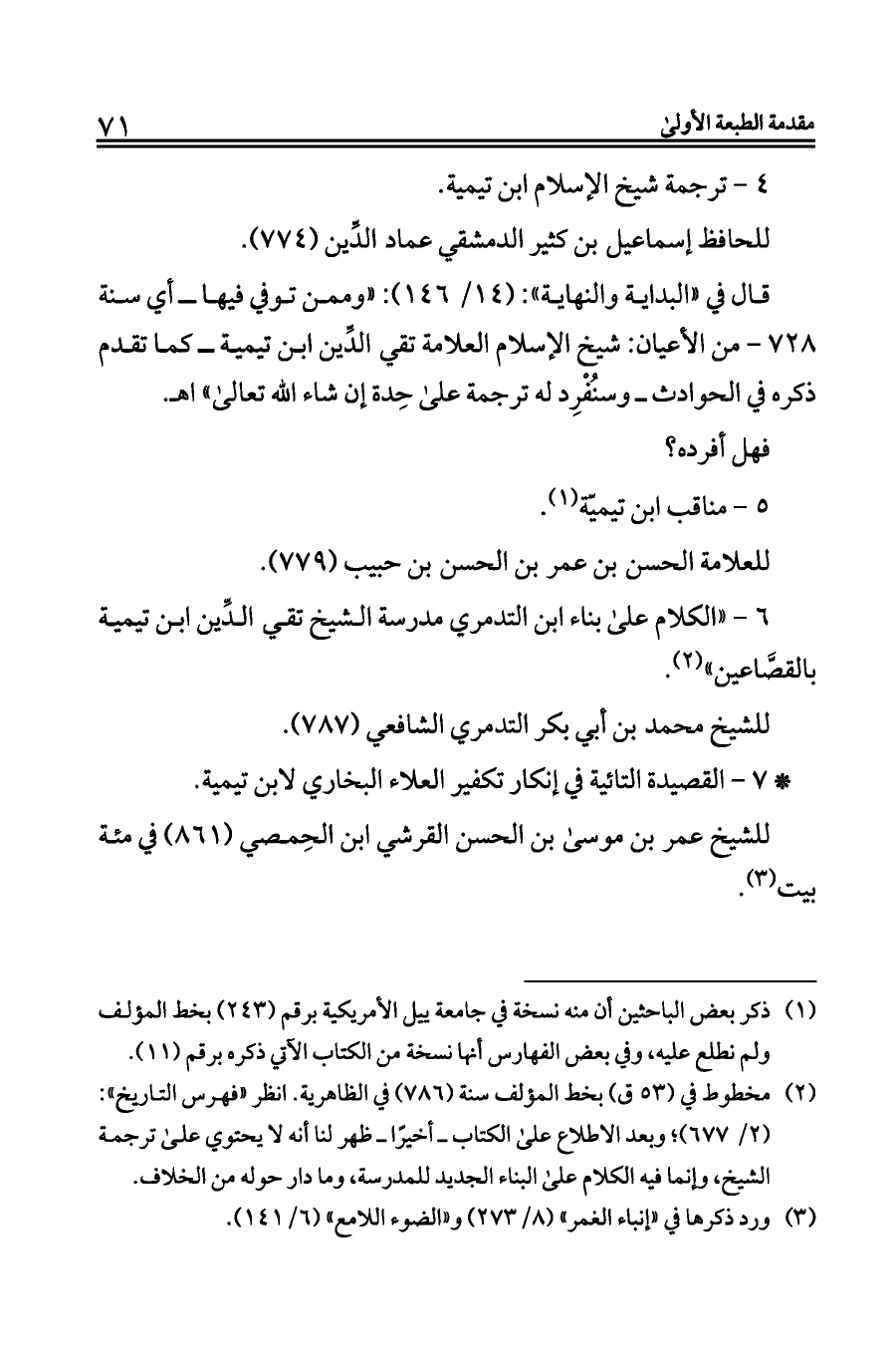 (¬٢). مخطوط في (٥٣ ق) بخط المؤلف سنة (٧٨٦) في الظاهرية. انظر «فهرس التاريخ»: (٢/ ٦٧٧)؛ وبعد الاطلاع على الكتاب ــ أخيرًا ــ ظهر لنا أنه لا يحتوي على ترجمة الشيخ، وإنما فيه الكلام على البناء الجديد للمدرسة، وما دار حوله من الخلاف.
