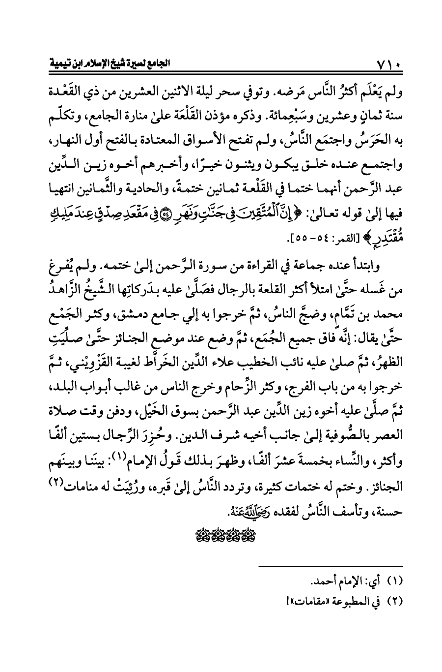 وابتدأ عنده جماعة في القراءة من سورة الرَّحمن إلى ختمه. ولم يُفرغ من غَسله حتَّى امتلأ أكثر القلعة بالرجال فصَلَّى عليه بدَركاتِها الشَّيخُ الزَّاهدُ محمد بن تَمَّامٍ، وضجَّ الناسُ، ثمَّ خرجوا به إلي جامع دمشق، وكثر الجَمْع حتَّى يقال: إنَّه فاق جميع الجُمَع، ثمَّ وضع عند موضع الجنائز حتَّى صلِّيَتِ الظهرُ، ثمَّ صلى عليه نائب الخطيب علاء الدِّين الخَراَّط لغيبة القَزْوِيْني، ثمَّ خرجوا به من باب الفرج، وكثر الزِّحام وخرج الناس من غالب أبواب البلد، ثمَّ صلَّى عليه أخوه زين الدِّين عبد الرَّحمن بسوق الخَيْل، ودفن وقت صلاة العصر بالصُّوفية إلى جانب أخيه شرف الدين. وحُزِرَ الرِّجال بستين ألفًا وأكثر، والنِّساء بخمسةَ عشرَ ألفًا، وظهرَ بذلك قَولُ الإمام (¬١): بينَنا وبينَهم الجنائز. وختم له ختمات كثيرة، وتردد النَّاسُ إلى قَبره، ورُئِيَتْ له منامات (¬٢) حسنة، وتأسف النَّاسُ لفقده - رضي الله عنه -.