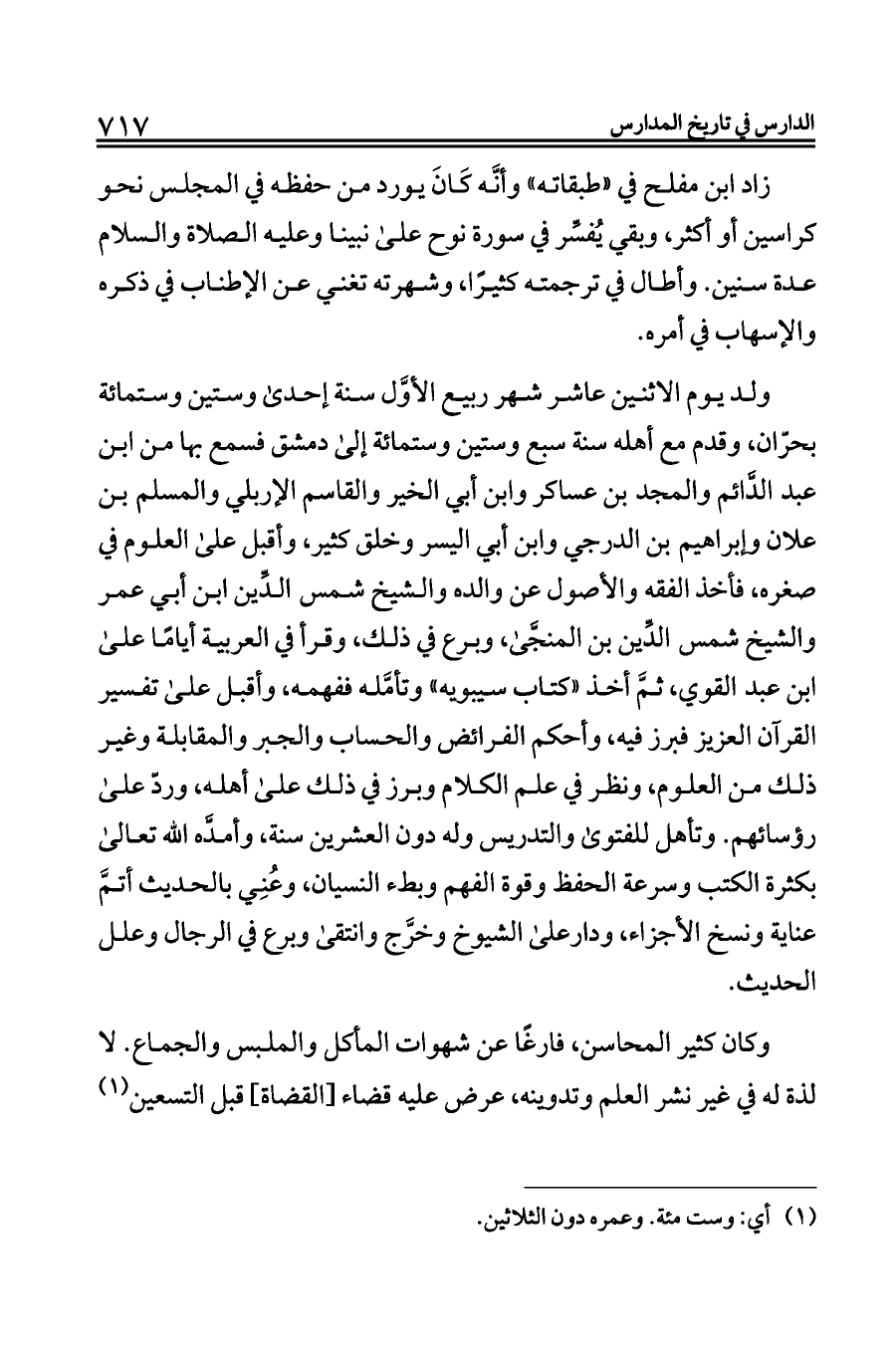 ولد يوم الاثنين عاشر شهر ربيع الأوَّل سنة إحدى وستين وستمائة بحرّان، وقدم مع أهله سنة سبع وستين وستمائة إلى دمشق فسمع بها من ابن عبد الدَّائم والمجد بن عساكر وابن أبي الخير والقاسم الإربلي والمسلم بن علان وإبراهيم بن الدرجي وابن أبي اليسر وخلق كثير، وأقبل على العلوم في صغره، فأخذ الفقه والأصول عن والده والشيخ شمس الدِّين ابن أبي عمر والشيخ شمس الدِّين بن المنجَّى، وبرع في ذلك، وقرأ في العربية أيامًا على ابن عبد القوي، ثمَّ أخذ «كتاب سيبويه» وتأمَّله ففهمه، وأقبل على تفسير القرآن العزيز فبرز فيه، وأحكم الفرائض والحساب والجبر والمقابلة وغير ذلك من العلوم، ونظر في علم الكلام وبرز في ذلك على أهله، وردّ على رؤسائهم. وتأهل للفتوى والتدريس وله دون العشرين سنة، وأمدَّه الله تعالى بكثرة الكتب وسرعة الحفظ وقوة الفهم وبطء النسيان، وعُنِي بالحديث أتمَّ عناية ونسخ الأجزاء، ودارعلى الشيوخ وخرَّج وانتقى وبرع في الرجال وعلل الحديث.
