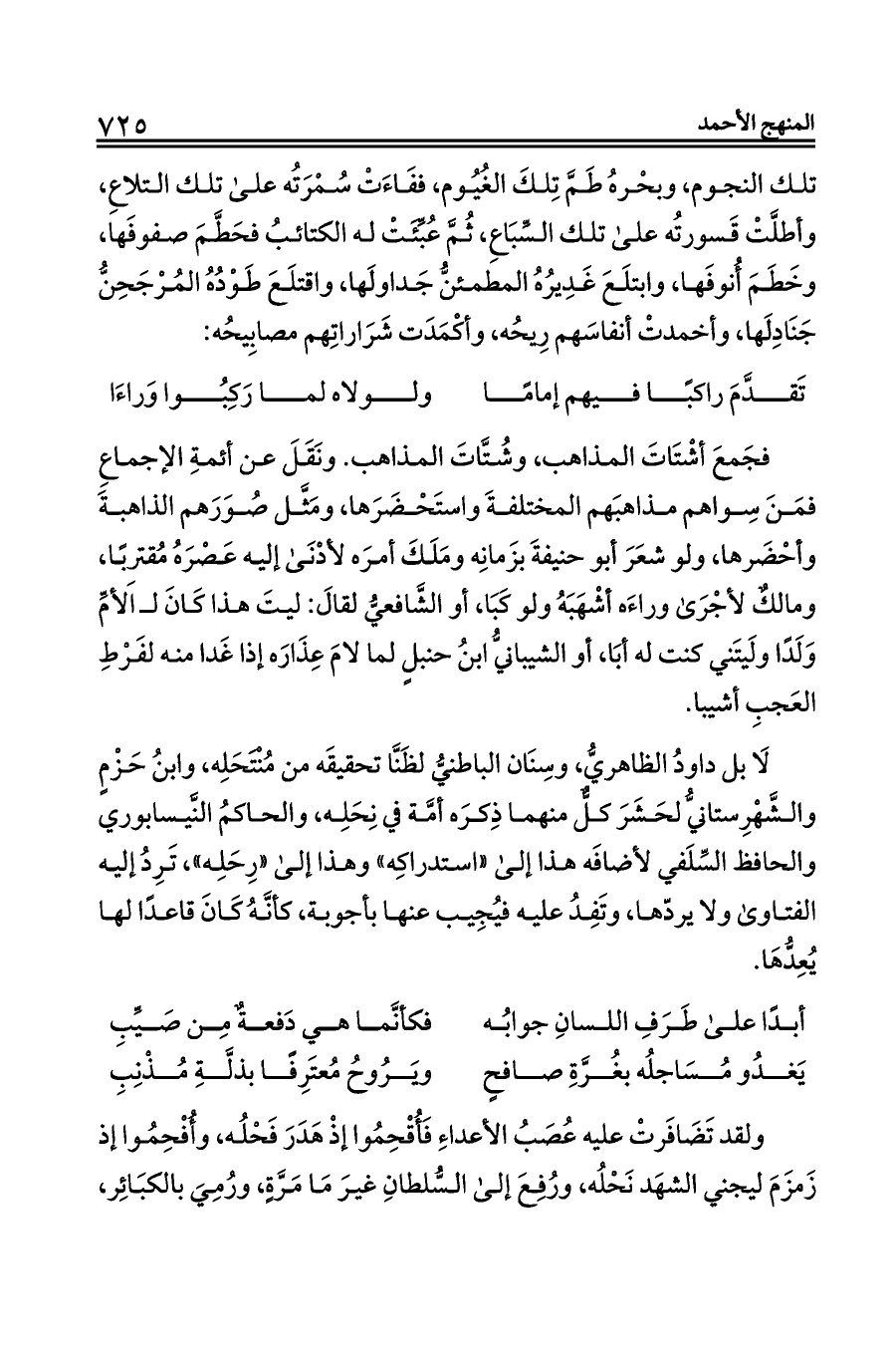 فجَمعَ أشْتَاتَ المذاهب، وشُتَّاتَ المذاهب. ونَقَلَ عن أئمةِ الإجماعِ فمَنَ سِواهم مذاهبَهم المختلفةَ واستَحْضَرَها، ومَثَّل صُوَرَهم الذاهبةَ وأحْضَرها، ولو شعَرَ أبو حنيفةَ بزَمانِه ومَلَكَ أمرَه لأدْنَى إليه عَصْرَهُ مُقترِبًا، ومالكٌ لأجْرَى وراءَه أشْهَبَهُ ولو كَبَا، أو الشَّافعيُّ لقالَ: ليتَ هذا كَانَ لـ الأمِّ وَلَدًا ولَيتَني كنت له أبَا، أو الشيبانيُّ ابنُ حنبلٍ لما لامَ عِذَارَه إذا غَدا منه لفَرْطِ العَجبِ أشيبا.