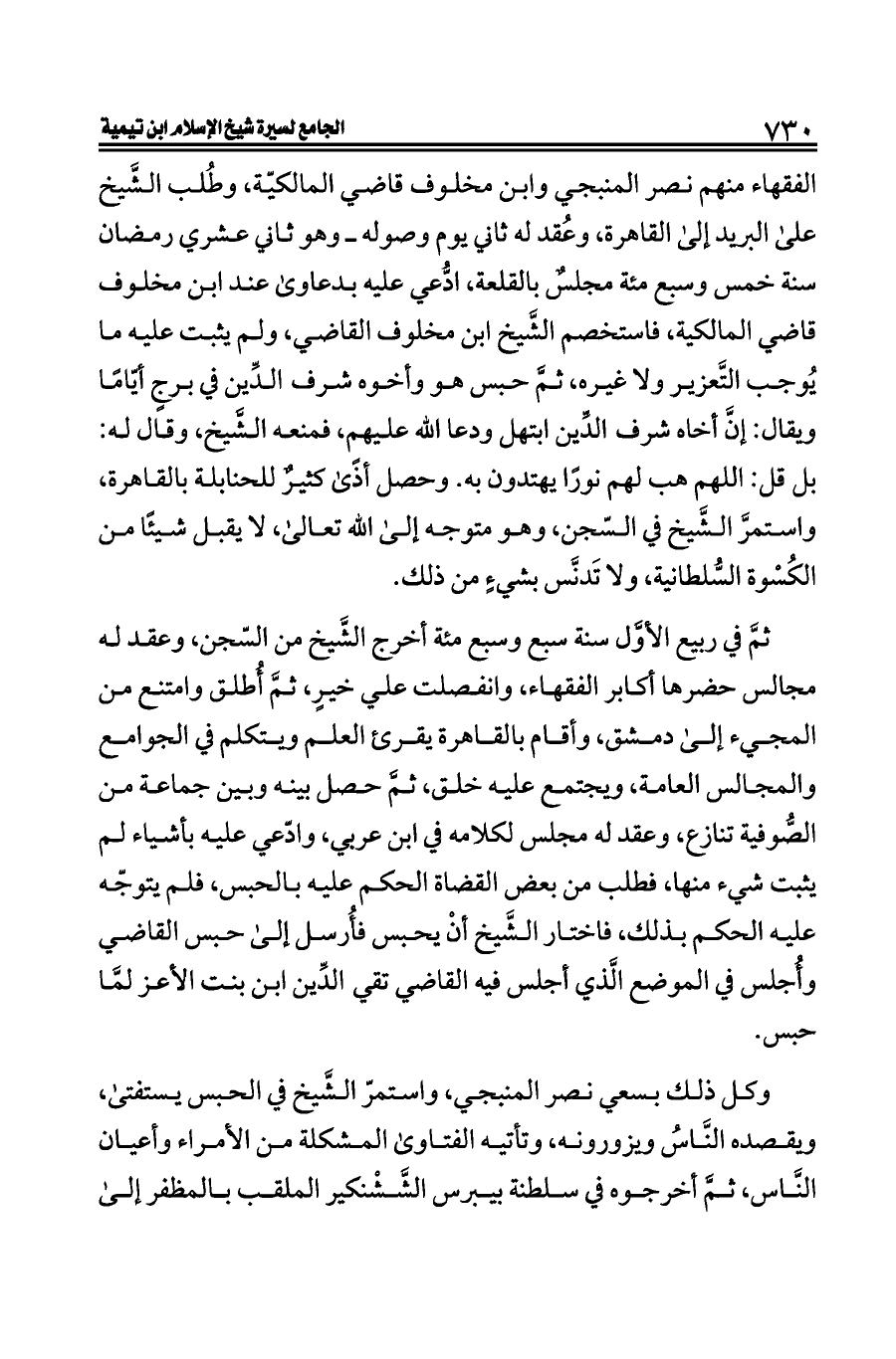 الفقهاء منهم نصر المنبجي وابن مخلوف قاضي المالكيّة، وطُلب الشَّيخ على البريد إلى القاهرة، وعُقد له ثاني يوم وصوله ــ وهو ثاني عشري رمضان سنة خمس وسبع مئة مجلسٌ بالقلعة، ادُّعي عليه بدعاوى عند ابن مخلوف قاضي المالكية، فاستخصم الشَّيخ ابن مخلوف القاضي، ولم يثبت عليه ما يُوجب التَّعزير ولا غيره، ثمَّ حبس هو وأخوه شرف الدِّين في برجٍ أيّامًا ويقال: إنَّ أخاه شرف الدِّين ابتهل ودعا الله عليهم، فمنعه الشَّيخ، وقال له: بل قل: اللهم هب لهم نورًا يهتدون به. وحصل أذًى كثيرٌ للحنابلة بالقاهرة، واستمرَّ الشَّيخ في السّجن، وهو متوجه إلى الله تعالى، لا يقبل شيئًا من الكُسْوة السُّلطانية، ولا تَدنَّس بشيءٍ من ذلك.