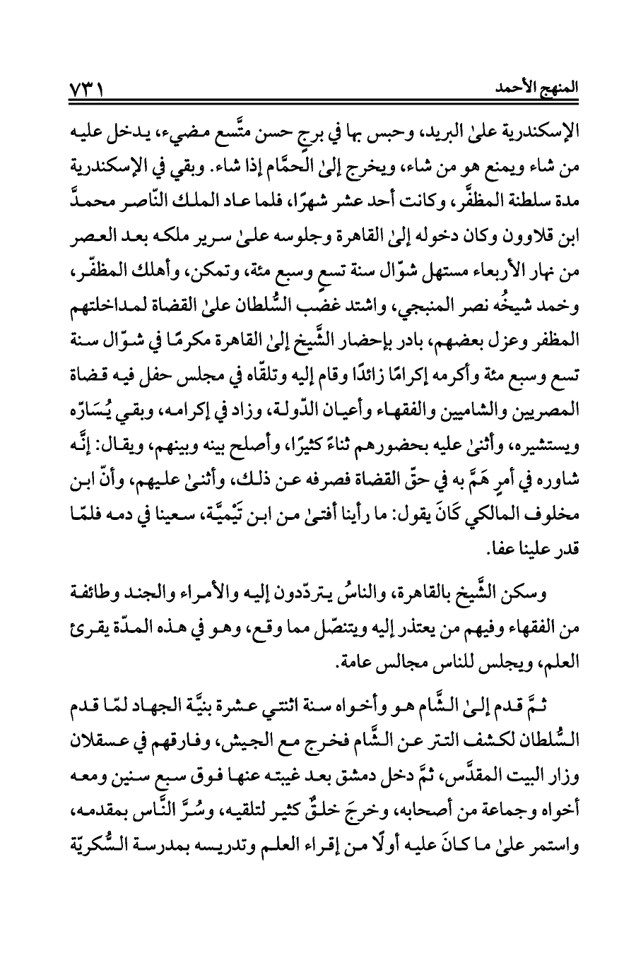 الإسكندرية على البريد، وحبس بها في برجٍ حسن متَّسع مضيء، يدخل عليه من شاء ويمنع هو من شاء، ويخرج إلى الحمَّام إذا شاء. وبقي في الإسكندرية مدة سلطنة المظفَّر، وكانت أحد عشر شهرًا، فلما عاد الملك النّاصر محمدَّ ابن قلاوون وكان دخوله إلى القاهرة وجلوسه على سرير ملكه بعد العصر من نهار الأربعاء مستهل شوّال سنة تسعٍ وسبع مئة، وتمكن، وأهلك المظفّر، وخمد شيخُه نصر المنبجي، واشتد غضب السُّلطان على القضاة لمداخلتهم المظفر وعزل بعضهم، بادر بإحضار الشَّيخ إلى القاهرة مكرمًا في شوّال سنة تسع وسبع مئة وأكرمه إكرامًا زائدًا وقام إليه وتلقّاه في مجلس حفل فيه قضاة المصريين والشاميين والفقهاء وأعيان الدّولة، وزاد في إكرامه، وبقي يُسَارّه ويستشيره، وأثنى عليه بحضورهم ثناءً كثيرًا، وأصلح بينه وبينهم، ويقال: إنَّه شاوره في أمرٍ هَمَّ به في حقّ القضاة فصرفه عن ذلك، وأثنى عليهم، وأنّ ابن مخلوف المالكي كَانَ يقول: ما رأينا أفتى من ابن تَيْميَّة، سعينا في دمه فلمّا قدر علينا عفا.
