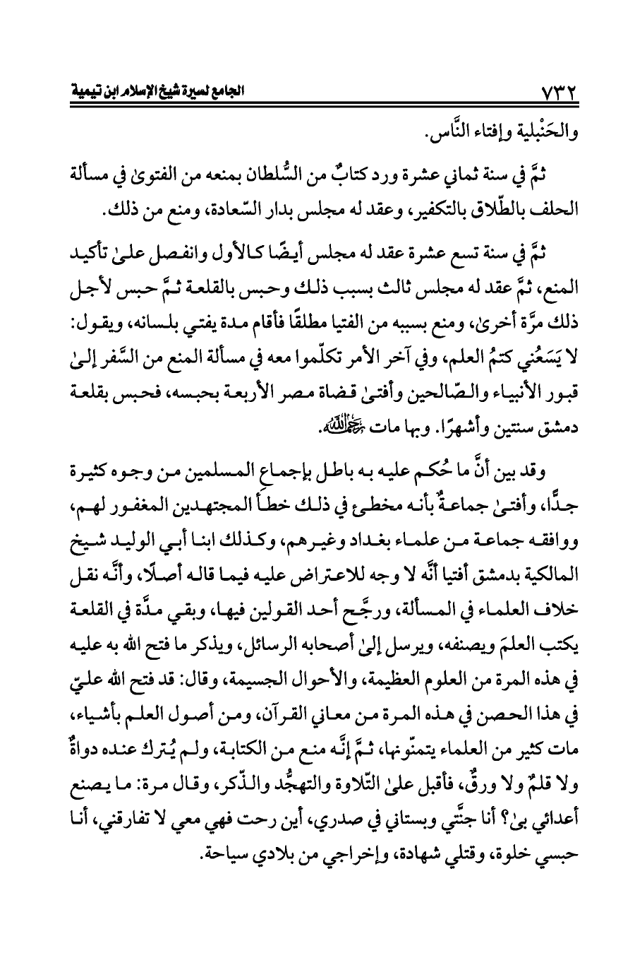 ثمَّ في سنة تسع عشرة عقد له مجلس أيضًا كالأول وانفصل على تأكيد المنع، ثمَّ عقد له مجلس ثالث بسبب ذلك وحبس بالقلعة ثمَّ حبس لأجل ذلك مرَّة أخرى، ومنع بسببه من الفتيا مطلقًا فأقام مدة يفتي بلسانه، ويقول: لا يَسَعُني كتمُ العلم، وفي آخر الأمر تكلّموا معه في مسألة المنع من السَّفر إلى قبور الأنبياء والصّالحين وأفتى قضاة مصر الأربعة بحبسه، فحبس بقلعة دمشق سنتين وأشهرًا. وبها مات - رحمه الله -.