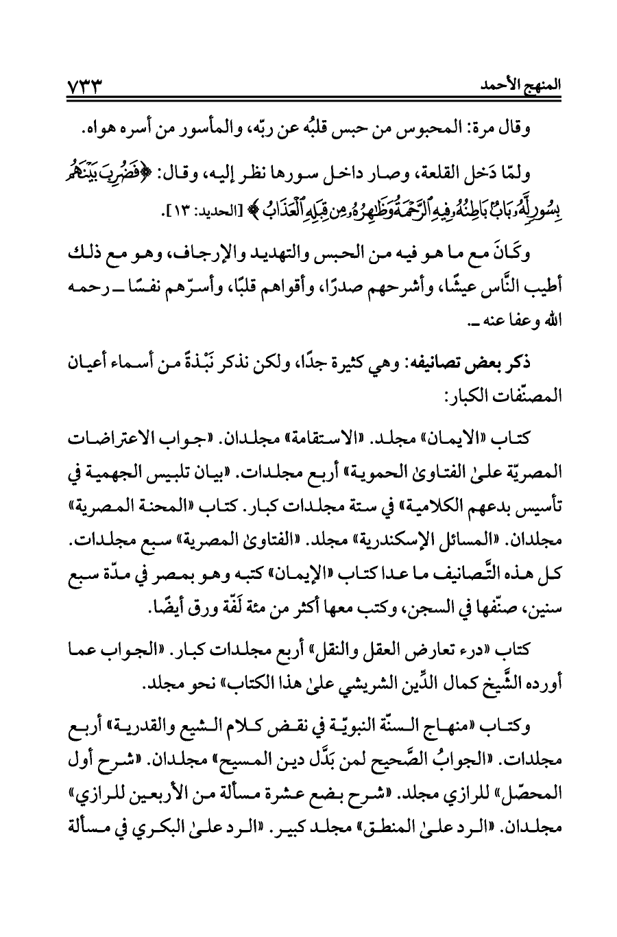 وكتاب «منهاج السنّة النبويّة في نقض كلام الشيع والقدرية» أربع مجلدات. «الجوابُ الصَّحيح لمن بَدَّل دين المسيح» مجلدان. «شرح أول المحصّل» للرازي مجلد. «شرح بضع عشرة مسألة من الأربعين للرازي» مجلدان. «الرد على المنطق» مجلد كبير. «الرد على البكري في مسألة