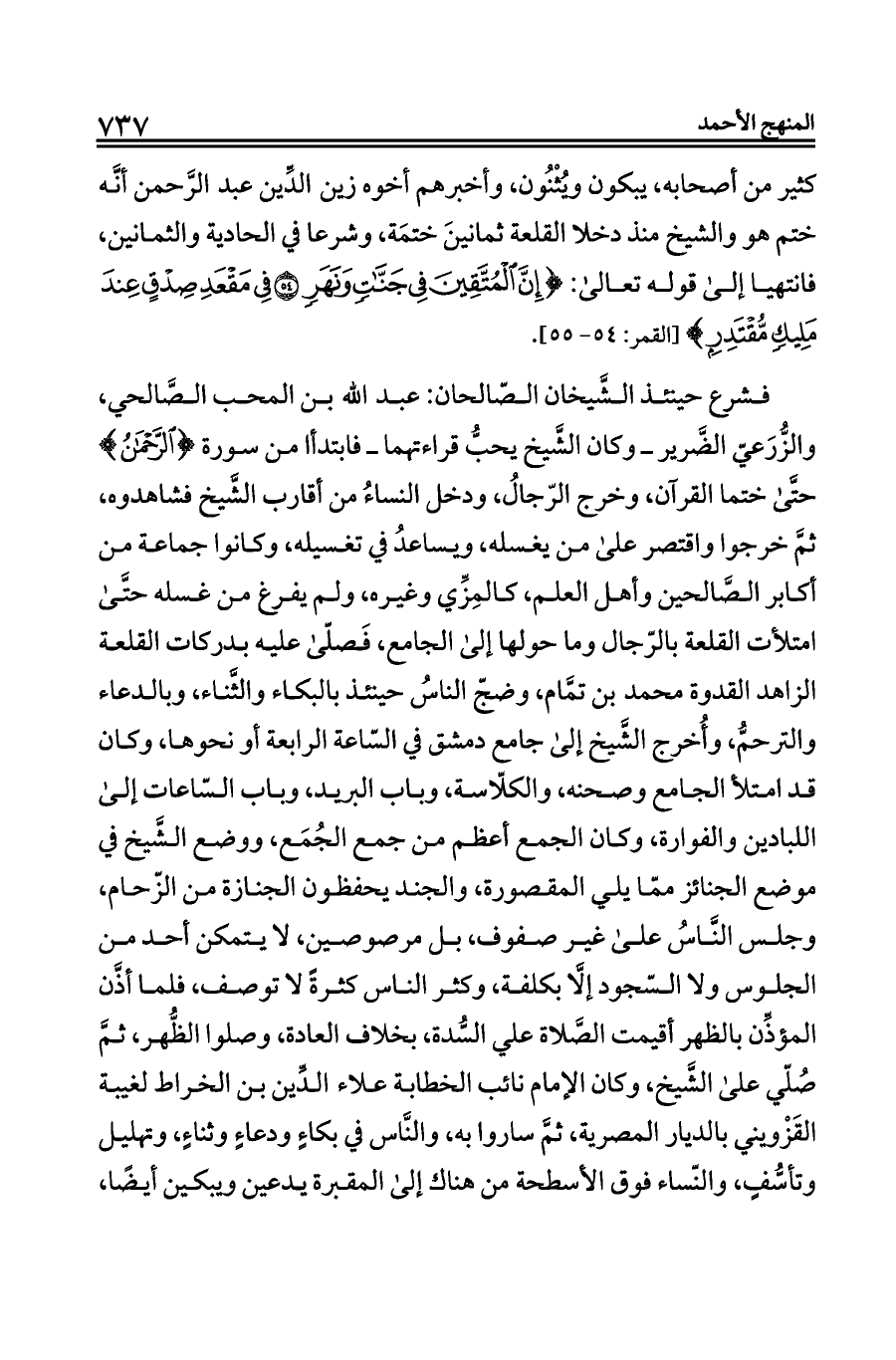 كثير من أصحابه، يبكون ويُثْنُون، وأخبرهم أخوه زين الدِّين عبد الرَّحمن أنَّه ختم هو والشيخ منذ دخلا القلعة ثمانينَ ختمَة، وشرعا في الحادية والثمانين، فانتهيا إلى قوله تعالى: {إِنَّ الْمُتَّقِينَ فِي جَنَّاتٍ وَنَهَرٍ (٥٤) فِي مَقْعَدِ صِدْقٍ عِنْدَ مَلِيكٍ مُقْتَدِرٍ} [القمر: ٥٤ - ٥٥].