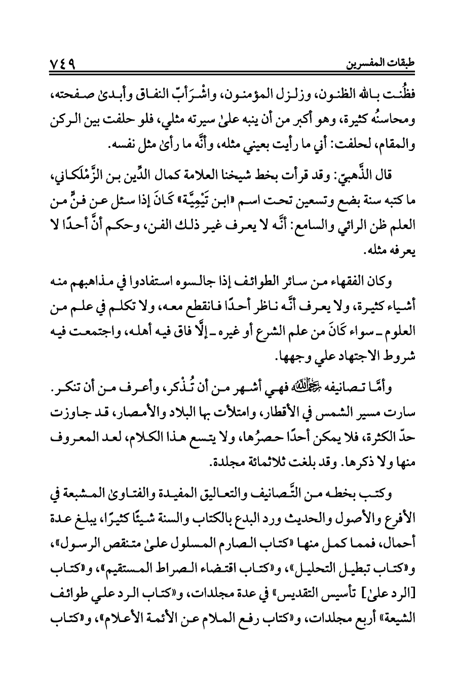 قال الذَّهبيّ: وقد قرأت بخط شيخنا العلامة كمال الدِّين بن الزَّمْلَكاني، ما كتبه سنة بضع وتسعين تحت اسم «ابن تَيْمِيَّة» كَانَ إذا سئل عن فنٍّ من العلم ظن الرائي والسامع: أنَّه لا يعرف غير ذلك الفن، وحكم أنَّ أحدًا لا يعرفه مثله.