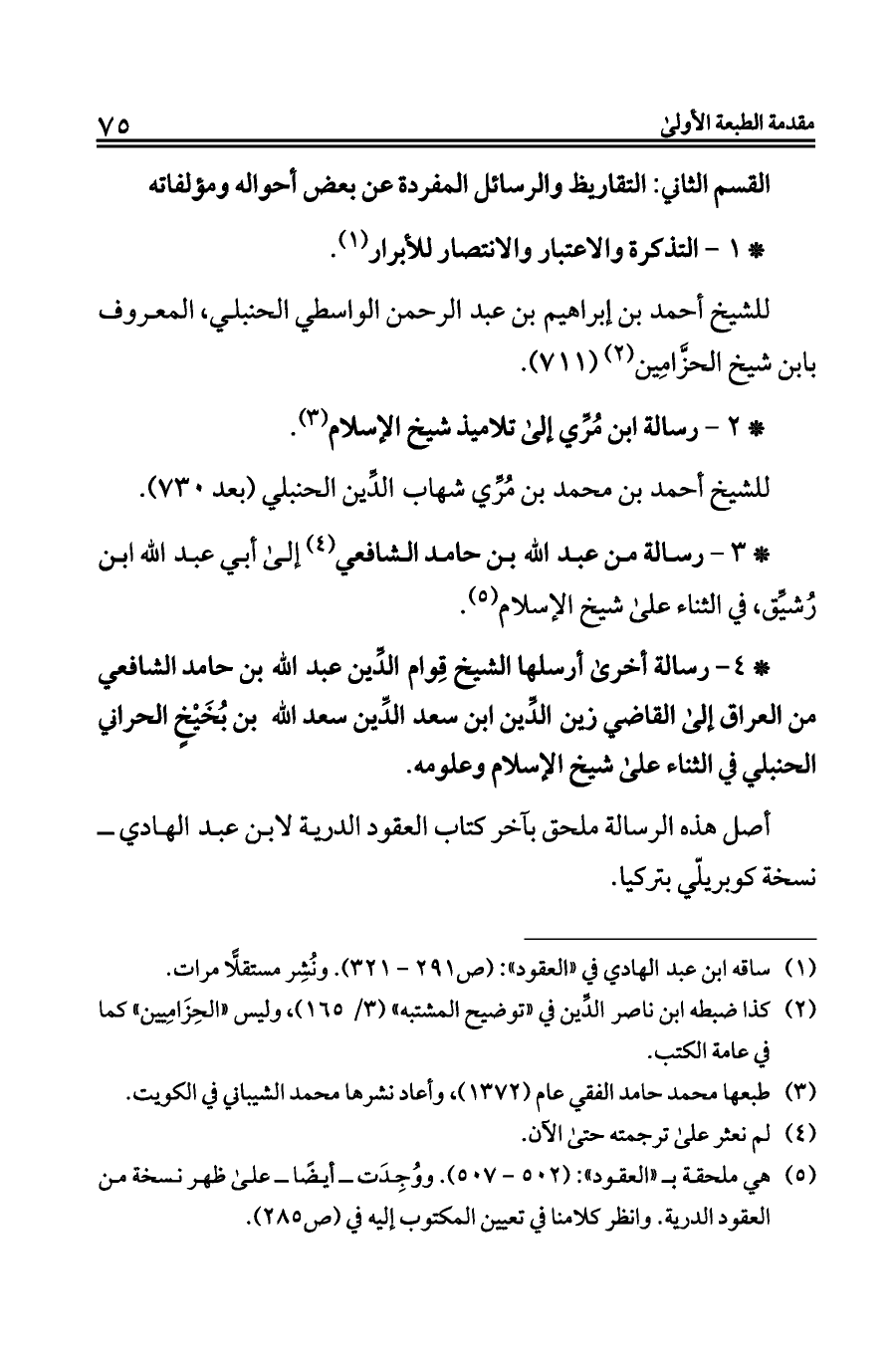 (¬٥). هي ملحقة بـ «العقود»: (٥٠٢ - ٥٠٧). ووُجِدَت ــ أيضًا ــ على ظهر نسخة من العقود الدرية. وانظر كلامنا في تعيين المكتوب إليه في (ص ٢٨٥).