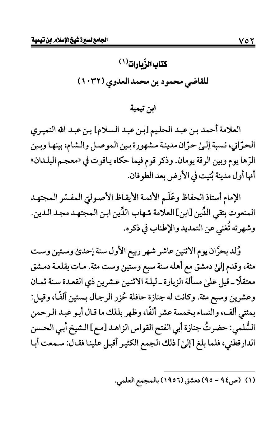 العلامة أحمد بن عبد الحليم [بن عبد السلام] بن عبد الله النميري الحرّاني، نسبة إلى حرّان مدينة مشهورة بين الموصل والشام، بينها وبين الرّها يوم وبين الرقة يومان. وذكر قوم فيما حكاه ياقوت في «معجم البلدان» أنها أول مدينة بُنيت في الأرض بعد الطوفان.