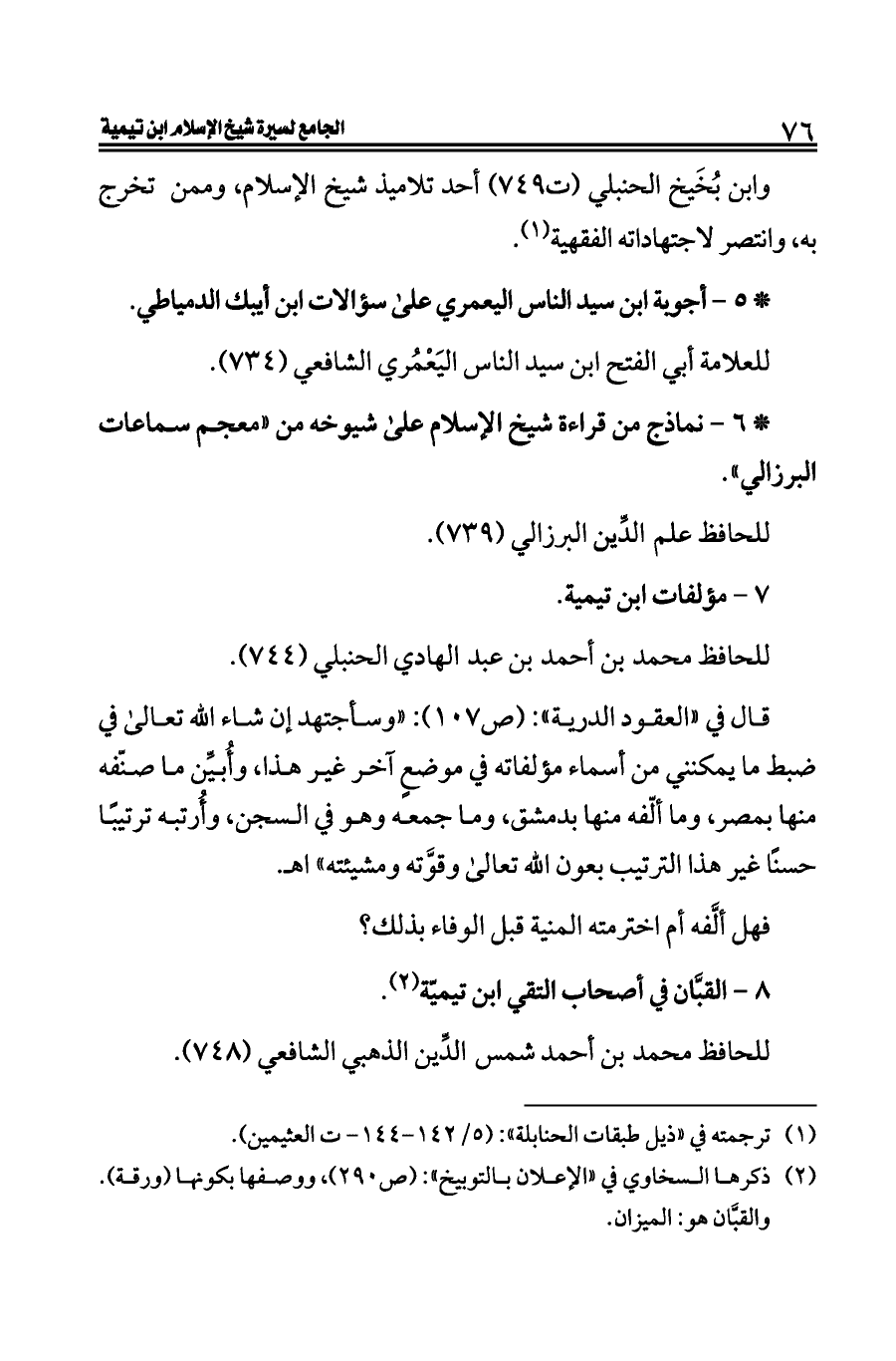 قال في «العقود الدرية»: (ص ١٠٧): «وسأجتهد إن شاء الله تعالى في ضبط ما يمكنني من أسماء مؤلفاته في موضعٍ آخر غير هذا، وأُبيِّن ما صنّفه منها بمصر، وما ألّفه منها بدمشق، وما جمعه وهو في السجن, وأُرتبه ترتيبًا حسنًا غير هذا الترتيب بعون الله تعالى وقوَّته ومشيئته» اهـ.