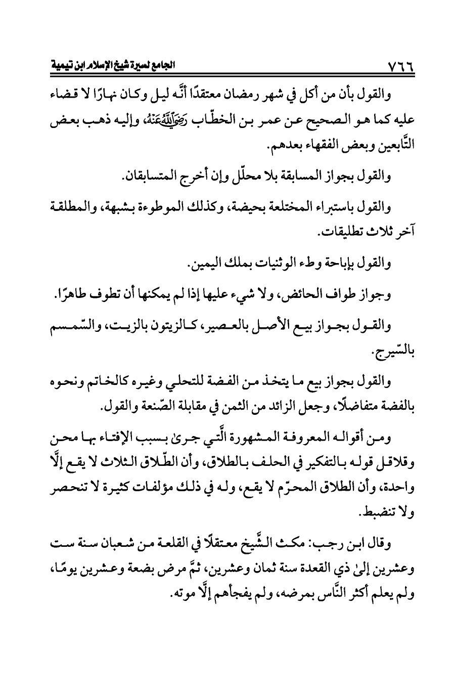 وقال ابن رجب: مكث الشَّيخ معتقلًا في القلعة من شعبان سنة ست وعشرين إلى ذي القعدة سنة ثمان وعشرين، ثمَّ مرض بضعة وعشرين يومًا، ولم يعلم أكثر النَّاس بمرضه، ولم يفجأهم إلَّا موته.