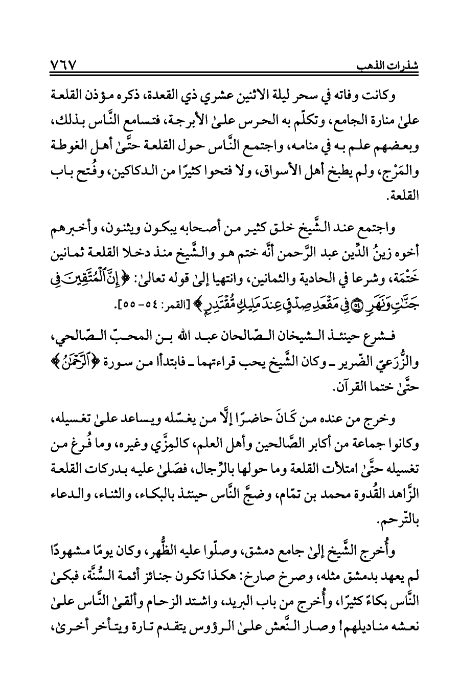 واجتمع عند الشَّيخ خلق كثير من أصحابه يبكون ويثنون، وأخبرهم أخوه زينُ الدِّين عبد الرَّحمن أنَّه ختم هو والشَّيخ منذ دخلا القلعة ثمانين خَتْمَة، وشرعا في الحادية والثمانين، وانتهيا إلى قوله تعالى: {إِنَّ الْمُتَّقِينَ فِي جَنَّاتٍ وَنَهَرٍ (٥٤) فِي مَقْعَدِ صِدْقٍ عِنْدَ مَلِيكٍ مُقْتَدِرٍ} [القمر: ٥٤ - ٥٥].