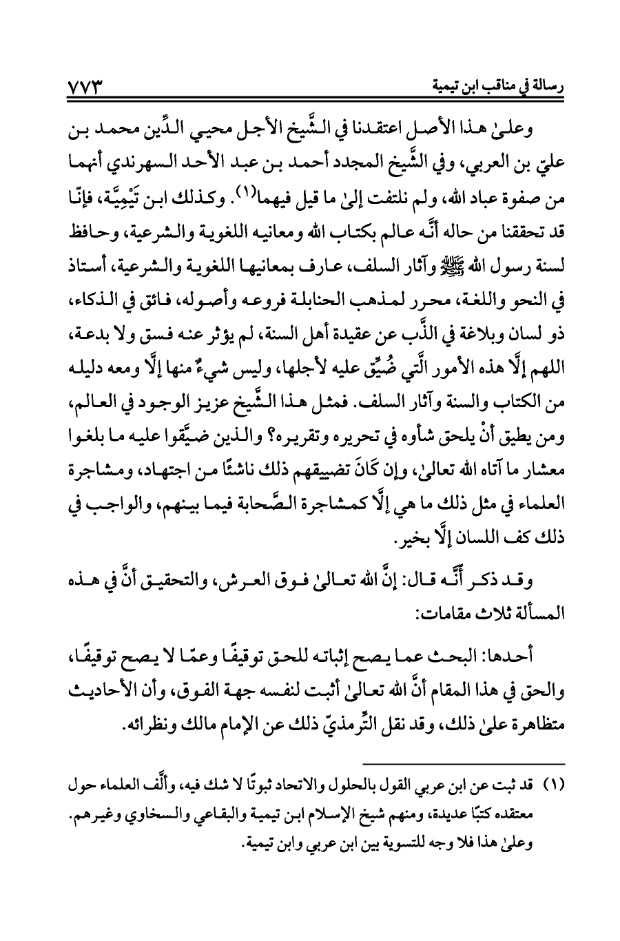وعلى هذا الأصل اعتقدنا في الشَّيخ الأجل محيي الدِّين محمد بن عليّ بن العربي، وفي الشَّيخ المجدد أحمد بن عبد الأحد السهرندي أنهما من صفوة عباد الله، ولم نلتفت إلى ما قيل فيهما (¬١). وكذلك ابن تَيْمِيَّة، فإنّا قد تحققنا من حاله أنَّه عالم بكتاب الله ومعانيه اللغوية والشرعية، وحافظ لسنة رسول الله - صلى الله عليه وسلم - وآثار السلف، عارف بمعانيها اللغوية والشرعية، أستاذ في النحو واللغة، محرر لمذهب الحنابلة فروعه وأصوله، فائق في الذكاء، ذو لسان وبلاغة في الذَّب عن عقيدة أهل السنة، لم يؤثر عنه فسق ولا بدعة، اللهم إلَّا هذه الأمور الَّتي ضُيِّق عليه لأجلها، وليس شيءٌ منها إلَّا ومعه دليله من الكتاب والسنة وآثار السلف. فمثل هذا الشَّيخ عزيز الوجود في العالم، ومن يطيق أنْ يلحق شأوه في تحريره وتقريره؟ والذين ضيَّقوا عليه ما بلغوا معشار ما آتاه الله تعالى، وإن كَانَ تضييقهم ذلك ناشئًا من اجتهاد، ومشاجرة العلماء في مثل ذلك ما هي إلَّا كمشاجرة الصَّحابة فيما بينهم، والواجب في ذلك كف اللسان إلَّا بخير.