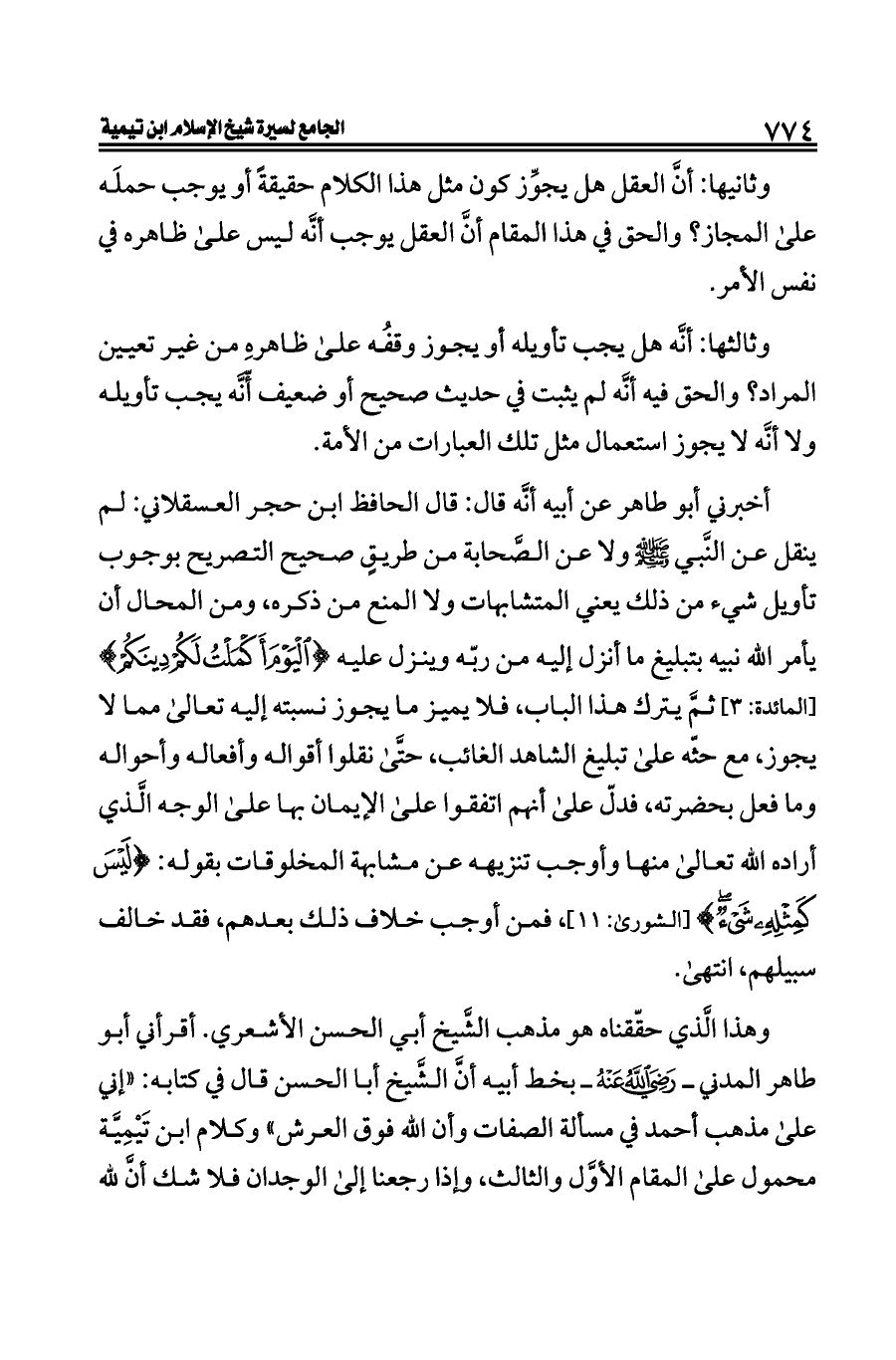 وهذا الَّذي حقّقناه هو مذهب الشَّيخ أبي الحسن الأشعري. أقرأني أبو طاهر المدني - رضي الله عنه - بخط أبيه أنَّ الشَّيخ أبا الحسن قال في كتابه: «إني على مذهب أحمد في مسألة الصفات وأن الله فوق العرش» وكلام ابن تَيْمِيَّة محمول على المقام الأوَّل والثالث، وإذا رجعنا إلى الوجدان فلا شك أنَّ لله