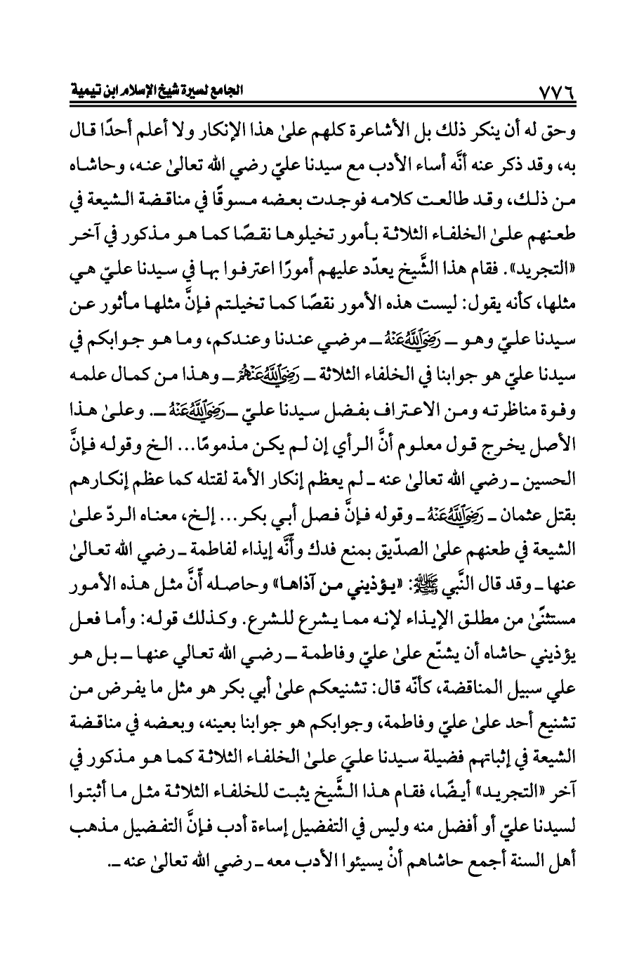 وكذلك قوله: وأما فعل يؤذيني حاشاه أن يشنّع على عليّ وفاطمة ــ رضي الله تعالي عنها ــ بل هو علي سبيل المناقضة، كأنّه قال: تشنيعكم على أبي بكر هو مثل ما يفرض من تشنيع أحد على عليّ وفاطمة، وجوابكم هو جوابنا بعينه، وبعضه في مناقضة الشيعة في إثباتهم فضيلة سيدنا عليَ على الخلفاء الثلاثة كما هو مذكور في آخر «التجريد» أيضًا، فقام هذا الشَّيخ يثبت للخلفاء الثلاثة مثل ما أثبتوا لسيدنا عليّ أو أفضل منه وليس في التفضيل إساءة أدب فإنَّ التفضيل مذهب أهل السنة أجمع حاشاهم أنْ يسيئوا الأدب معه ــ رضي الله تعالى عنه ــ.