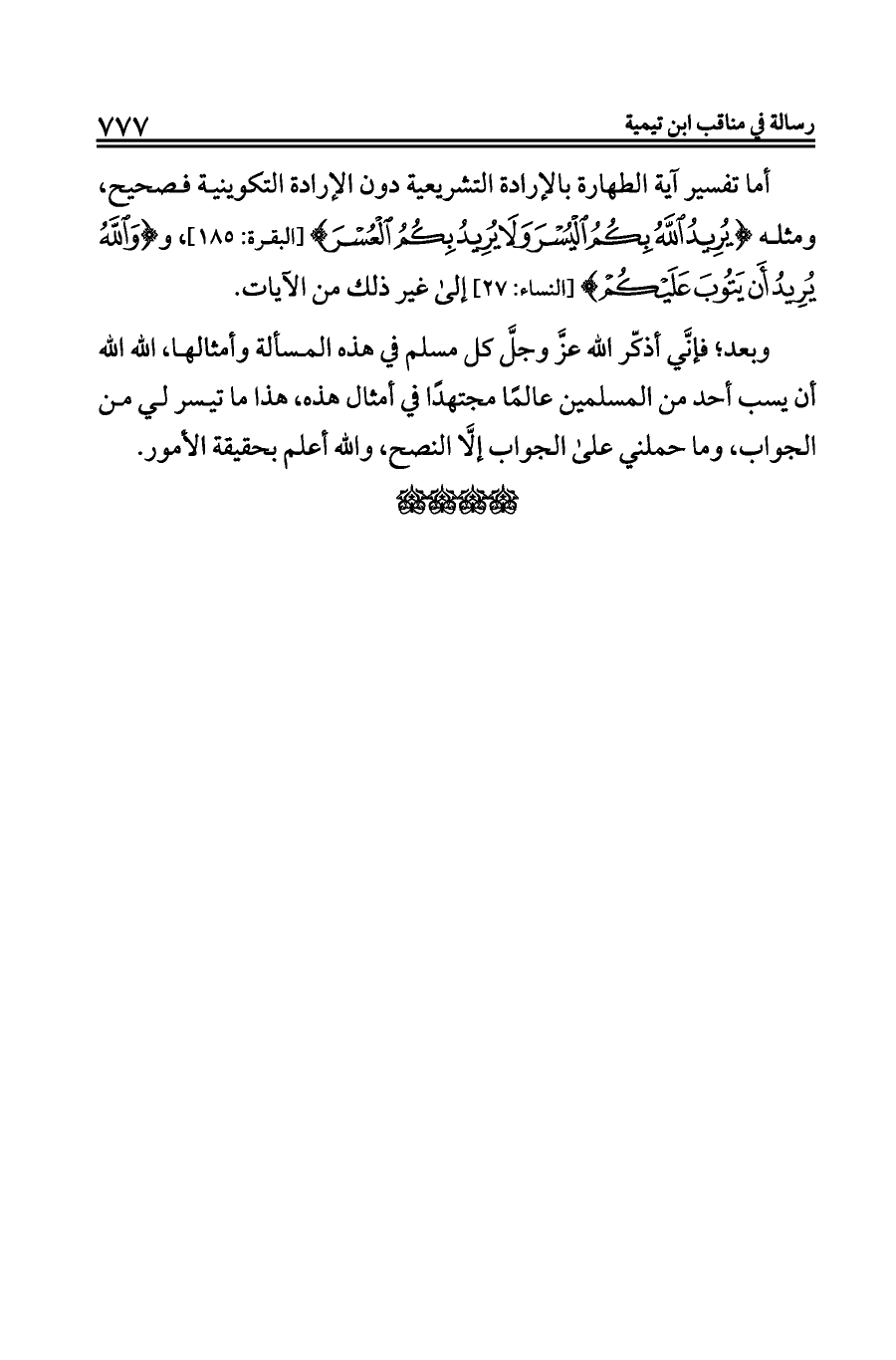 أما تفسير آية الطهارة بالإرادة التشريعية دون الإرادة التكوينية فصحيح، ومثله {يُرِيدُ اللَّهُ بِكُمُ الْيُسْرَ وَلَا يُرِيدُ بِكُمُ} [البقرة: ١٨٥]، و {وَاللَّهُ يُرِيدُ أَنْ يَتُوبَ عَلَيْكُمْ} [النساء: ٢٧] إلى غير ذلك من الآيات.