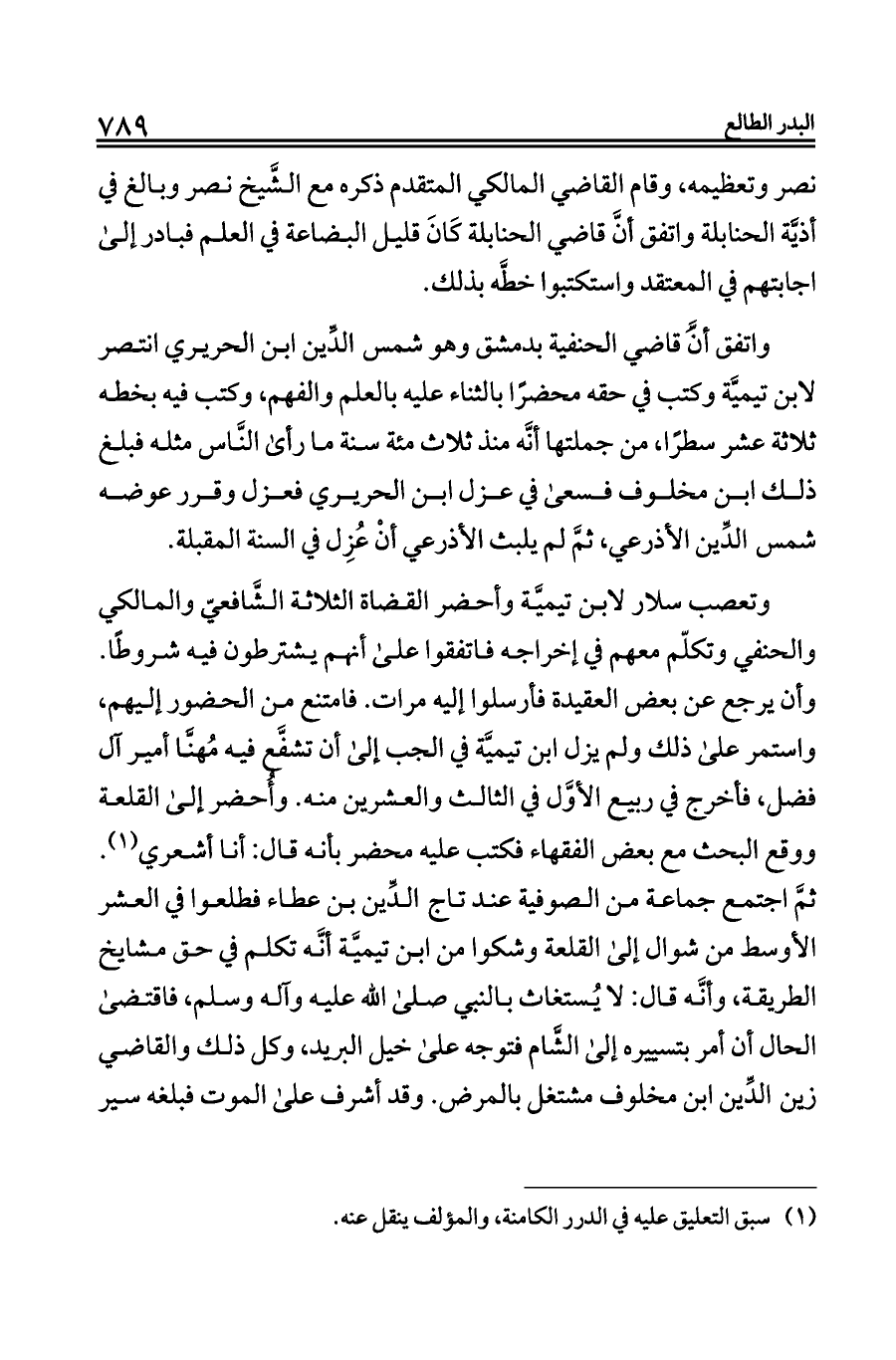 وتعصب سلار لابن تيميَّة وأحضر القضاة الثلاثة الشَّافعيّ والمالكي والحنفي وتكلّم معهم في إخراجه فاتفقوا على أنهم يشترطون فيه شروطًا. وأن يرجع عن بعض العقيدة فأرسلوا إليه مرات. فامتنع من الحضور إليهم، واستمر على ذلك ولم يزل ابن تيميَّة في الجب إلى أن تشفَّع فيه مُهنَّا أمير آل فضل، فأخرج في ربيع الأوَّل في الثالث والعشرين منه. وأُحضر إلى القلعة ووقع البحث مع بعض الفقهاء فكتب عليه محضر بأنه قال: أنا أشعري (¬١). ثمَّ اجتمع جماعة من الصوفية عند تاج الدِّين بن عطاء فطلعوا في العشر الأوسط من شوال إلى القلعة وشكوا من ابن تيميَّة أنَّه تكلم في حق مشايخ الطريقة، وأنَّه قال: لا يُستغاث بالنبي صلى الله عليه وآله وسلم، فاقتضى الحال أن أمر بتسييره إلى الشَّام فتوجه على خيل البريد، وكل ذلك والقاضي زين الدِّين ابن مخلوف مشتغل بالمرض. وقد أشرف على الموت فبلغه سير