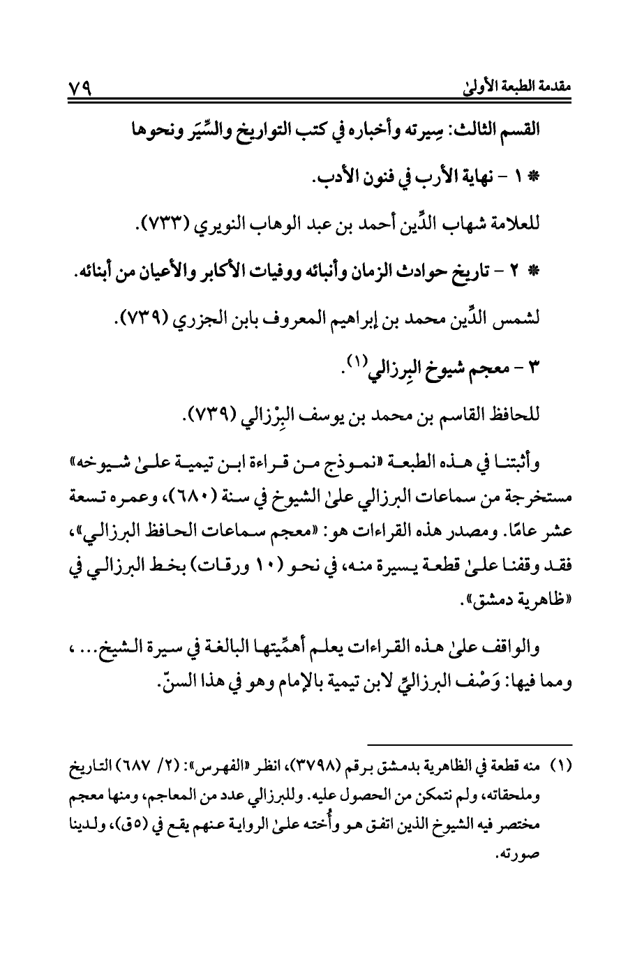 وأثبتنا في هذه الطبعة «نموذج من قراءة ابن تيمية على شيوخه» مستخرجة من سماعات البرزالي على الشيوخ في سنة (٦٨٠)، وعمره تسعة عشر عامًا. ومصدر هذه القراءات هو: «معجم سماعات الحافظ البرزالي»، فقد وقفنا على قطعة يسيرة منه، في نحو (١٠ ورقات) بخط البرزالي في «ظاهرية دمشق».