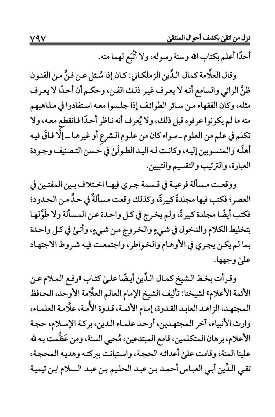 وقرأت بخط الشيخ كمال الدِّين أيضًا على كتاب «رفع الملام عن الأئمة الأعلام» لشيخنا: تأليف الشيخ الإمام العالم العلَّامة الأوحد، الحافظ المجتهد، الزاهد العابد القدوة، إمام الأئمة، قدوة الأُمة، علّامة العلماء، وارث الأنبياء، آخر المجتهدين، أوحد علماء الدين، بركة الإسلام، حجة الأعلام، برهان المتكلمين، قامع المبتدعين، مُحيي السنة، ومن عَظُمت به لله علينا المنة، وقامت على أعدائه الحجة، واستبانت ببركته وهديه المحجة، تقي الدِّين أبي العباس أحمد بن عبد الحليم بن عبد السلام ابن تيمية