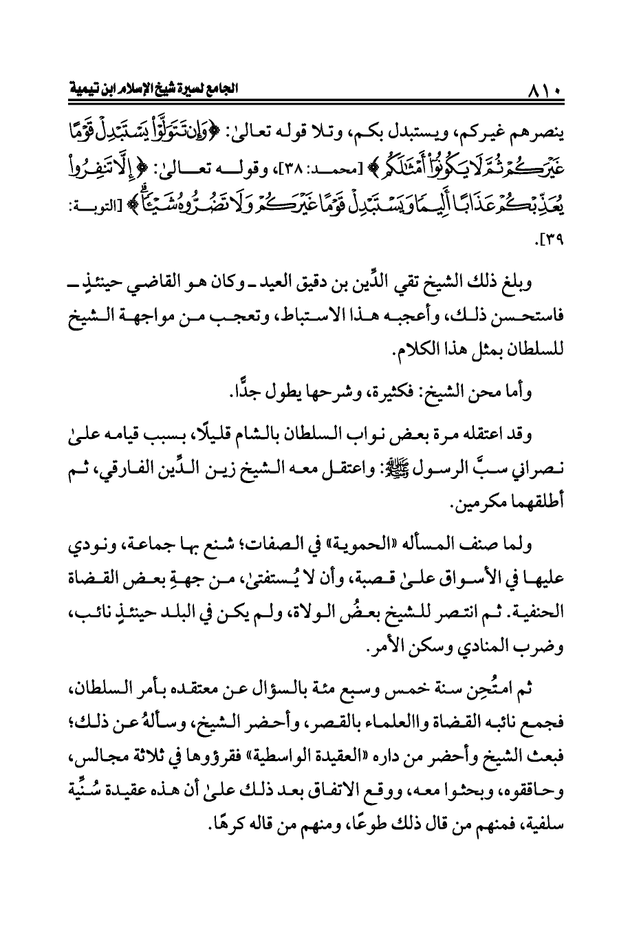 ثم امتُحِن سنة خمس وسبع مئة بالسؤال عن معتقده بأمر السلطان، فجمع نائبه القضاة واالعلماء بالقصر، وأحضر الشيخ، وسألهُ عن ذلك؛ فبعث الشيخ وأحضر من داره «العقيدة الواسطية» فقرؤوها في ثلاثة مجالس، وحاققوه، وبحثوا معه، ووقع الاتفاق بعد ذلك على أن هذه عقيدة سُنِّية سلفية، فمنهم من قال ذلك طوعًا، ومنهم من قاله كرهًا.