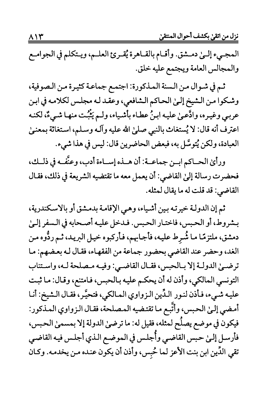 ثم إن الدولة خيرته بين أشياء، وهي الإقامة بدمشق أو بالاسكندرية، بشروط، أو الحبس، فاختار الحبس. فدخل عليه أصحابه في السفر إلى دمشق، ملتزمًا ما شُرِط عليه، فأجابهم، فأركبوه خيل البريد، ثم ردُّوه من الغد، وحضر عند القاضي بحضور جماعة من الفقهاء، فقال له بعضهم: ما ترضى الدولة إلا بالحبس، فقال القاضي: وفيه مصلحة له، واستناب التونسي المالكي، وأذن له أن يحكم عليه بالحبس، فامتنع، وقال: ما ثبت عليه شيء، فأذن لنور الدِّين الزواوي المالكي، فتحيَّر، فقال الشيخ: أنا أمضي إلى الحبس، وأتَّبع ما تقتضيه المصلحة، فقال الزواوي المذكور: فيكون في موضع يصلُح لمثله، فقيل له: ما ترضى الدولة إلا بمسمى الحبس، فأرسل إلى حبس القاضي وأُجلس في الموضع الذي أجلس فيه القاضي تقي الدِّين ابن بنت الأعز لما حُبِس، وأذن أن يكون عنده من يخدمه. وكان