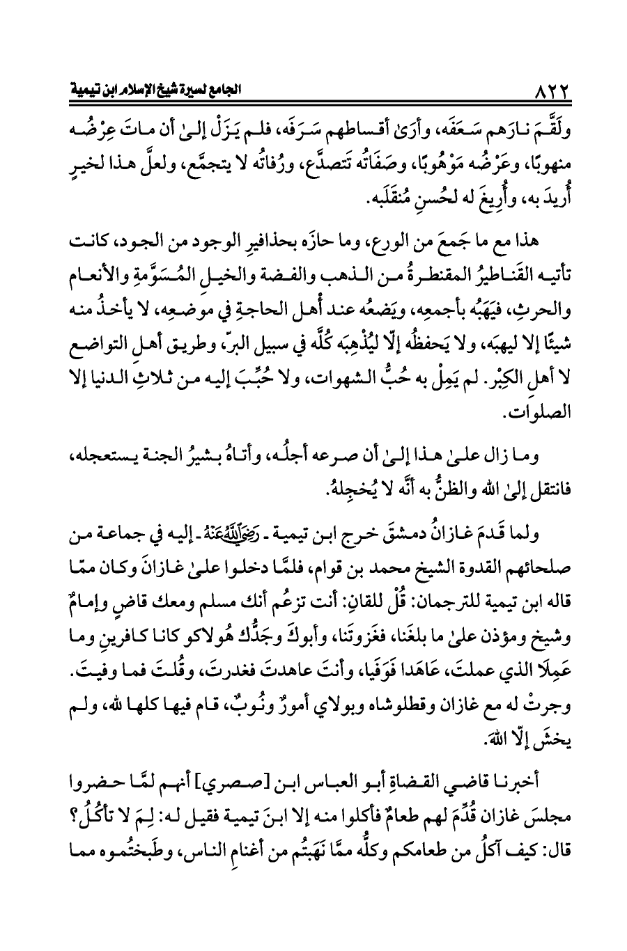 أخبرنا قاضي القضاةِ أبو العباس ابن [صصري] أنهم لمَّا حضروا مجلسَ غازان قُدِّمَ لهم طعامٌ فأكلوا منه إلا ابنَ تيمية فقيل له: لِمَ لا تأكُلُ؟ قال: كيف آكلُ من طعامكم وكلُّه ممَّا نَهَبتُم من أغنامِ الناس، وطَبختُموه مما