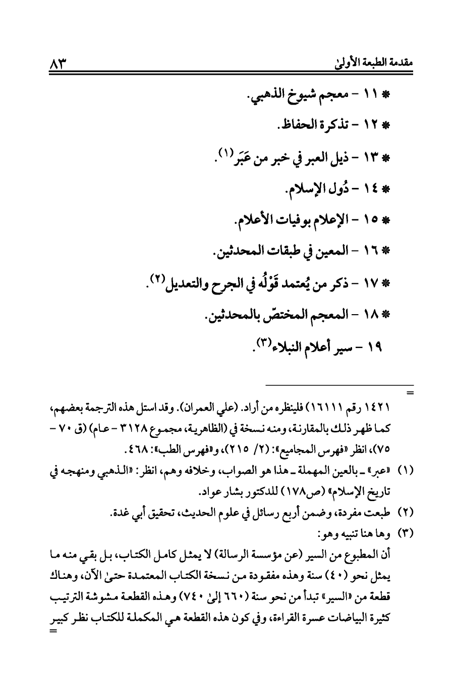 غير أن المحقق حاول أن يكمل ذاك النقص؛ فاجتلب نصوصًا منقولة عن الذهبي في المصادر، فأثبتها في الكتاب! وهذا تصرُّف غير مرضيٍّ، إذ لم نطلع على أحدٍ صرّح بالنقل عن «السير» في ترجمة الشيخ ــ فيما وقفنا عليه ــ.
