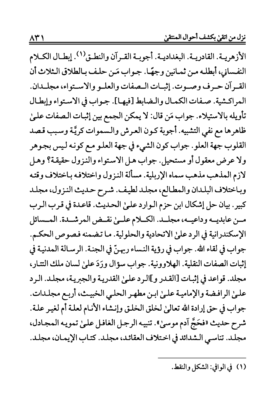 الأزهرية. القادرية. البغدادية. أجوبة القرآن والنطق (¬١). إبطال الكلام النفساني، أبطله من ثمانين وجهًا. جواب مَن حلف بالطلاق الثلاث أن القرآن حرف وصوت. إثبات الصفات والعلو والاستواء، مجلدان. المراكشية. صفات الكمال والضابط [فيها]. جواب في الاستواء وإبطال تأويله بالاستيلاء. جواب مَن قال: لا يمكن الجمع بين إثبات الصفات على ظاهرها مع نفي التشبيه. أجوبة كون العرش والسموات كريَّة وسبب قصد القلوب جهة العلو. جواب كون الشيء في جهة العلو مع كونه ليس بجوهر ولا عرض معقول أو مستحيل. جواب هل الاستواء والنزول حقيقة؟ وهل لازم المذهب مذهب سماه الإربلية. مسألة النزول واختلافه باختلاف وقته وباختلاف البلدان والمطالع، مجلد لطيف. شرح حديث النزول، مجلد كبير.