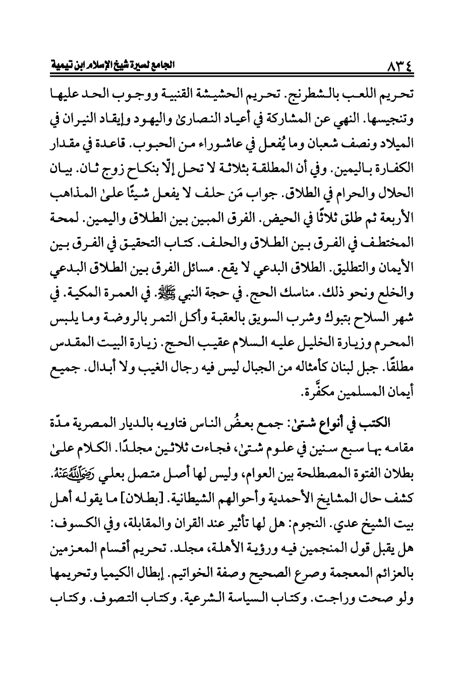 تحريم اللعب بالشطرنج. تحريم الحشيشة القنبية ووجوب الحد عليها وتنجيسها. النهي عن المشاركة في أعياد النصارى واليهود وإيقاد النيران في الميلاد ونصف شعبان وما يُفعل في عاشوراء من الحبوب. قاعدة في مقدار الكفارة باليمين. وفي أن المطلقة بثلاثة لا تحل إلّا بنكاح زوج ثان. بيان الحلال والحرام في الطلاق. جواب مَن حلف لا يفعل شيئًا على المذاهب الأربعة ثم طلق ثلاثًا في الحيض. الفرق المبين بين الطلاق واليمين.