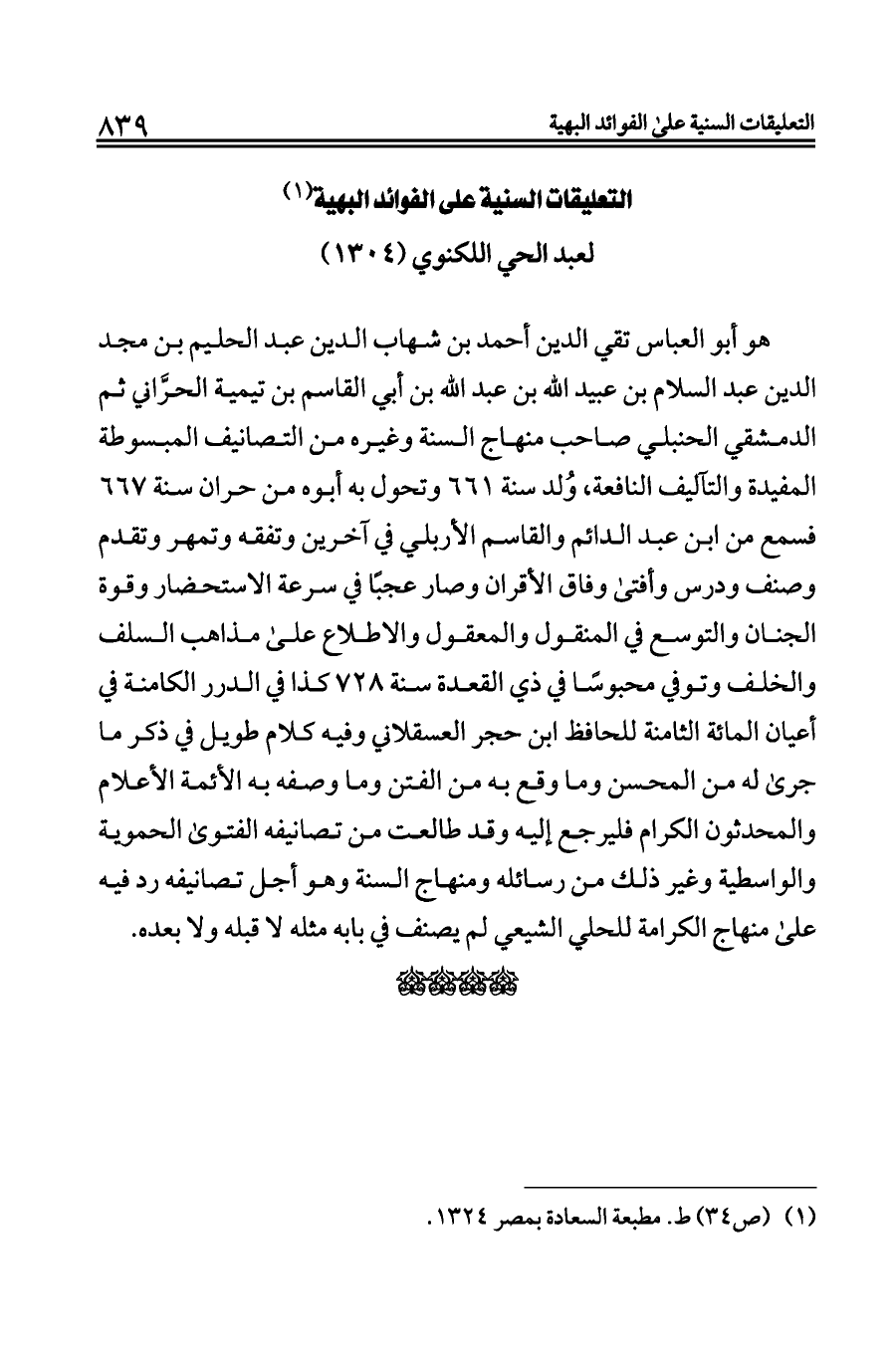 هو أبو العباس تقي الدين أحمد بن شهاب الدين عبد الحليم بن مجد الدين عبد السلام بن عبيد الله بن عبد الله بن أبي القاسم بن تيمية الحرَّاني ثم الدمشقي الحنبلي صاحب منهاج السنة وغيره من التصانيف المبسوطة المفيدة والتآليف النافعة، وُلد سنة ٦٦١ وتحول به أبوه من حران سنة ٦٦٧ فسمع من ابن عبد الدائم والقاسم الأربلي في آخرين وتفقه وتمهر وتقدم وصنف ودرس وأفتى وفاق الأقران وصار عجبًا في سرعة الاستحضار وقوة الجنان والتوسع في المنقول والمعقول والاطلاع على مذاهب السلف والخلف وتوفي محبوسًا في ذي القعدة سنة ٧٢٨ كذا في الدرر الكامنة في أعيان المائة الثامنة للحافظ ابن حجر العسقلاني وفيه كلام طويل في ذكر ما جرى له من المحسن وما وقع به من الفتن وما وصفه به الأئمة الأعلام والمحدثون الكرام فليرجع إليه وقد طالعت من تصانيفه الفتوى الحموية والواسطية وغير ذلك من رسائله ومنهاج السنة وهو أجل تصانيفه رد فيه على منهاج الكرامة للحلي الشيعي لم يصنف في بابه مثله لا قبله ولا بعده.