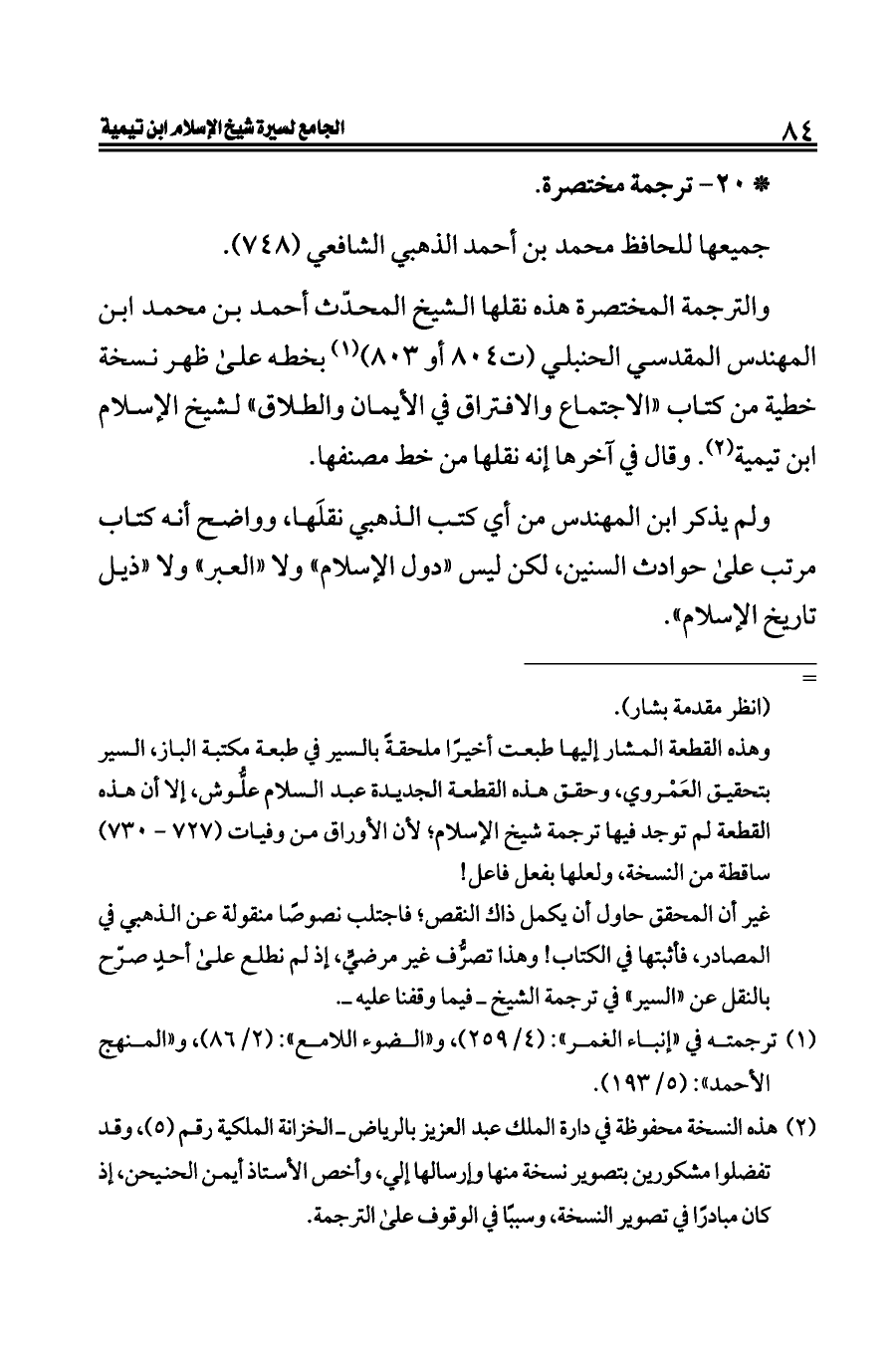 كتاب الجامع لسيرة شيخ الإسلام ابن تيمية خلال سبعة قرون وتكملة الجامع