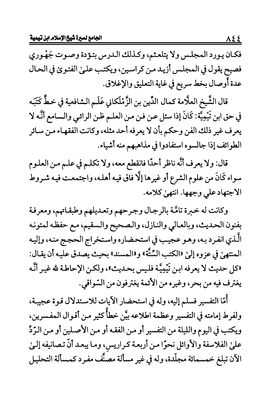 قال الشَّيخ العلَّامة كمال الدِّين بن الزَّمْلَكاني عَلَم الشافعية في خطٍّ كَتَبَه في حق ابن تَيْمِيَّة: كَانَ إذا سئل عن فن من العلم ظن الرائي والسامع أنَّه لا يعرف غير ذلك الفن وحكم بأن لا يعرفه أحد مثله، وكانت الفقهاء من سائر الطوائف إذا جالسوه استفادوا في مذاهبهم منه أشياء.