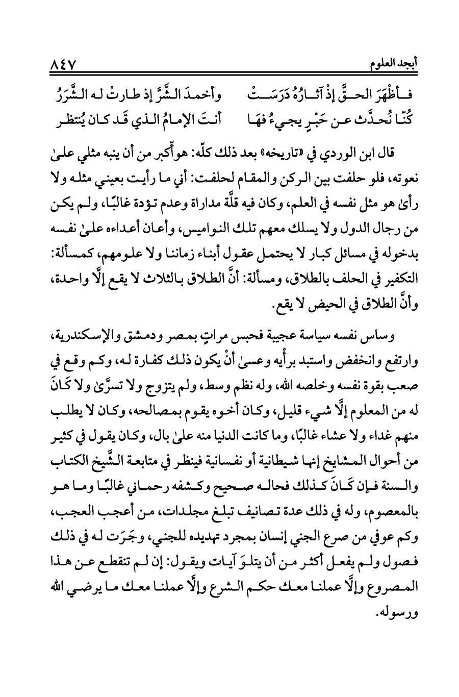 وساس نفسه سياسة عجيبة فحبس مراتٍ بمصر ودمشق والإسكندرية، وارتفع وانخفض واستبد برأْيه وعسى أنْ يكون ذلك كفارة له، وكم وقع في صعب بقوة نفسه وخلصه الله، وله نظم وسط، ولم يتزوج ولا تسرَّى ولا كَانَ له من المعلوم إلَّا شيء قليل، وكان أخوه يقوم بمصالحه، وكان لا يطلب منهم غداء ولا عشاء غالبًا، وما كانت الدنيا منه على بال، وكان يقول في كثير من أحوال المشايخ إنها شيطانية أو نفسانية فينظر في متابعة الشَّيخ الكتاب والسنة فإن كَانَ كذلك فحاله صحيح وكشفه رحماني غالبًا وما هو بالمعصوم، وله في ذلك عدة تصانيف تبلغ مجلدات، من أعجب العجب، وكم عوفي من صرع الجني إنسان بمجرد تهديده للجني، وجَرَت له في ذلك فصول ولم يفعل أكثر من أن يتلوَ آيات ويقول: إن لم تنقطع عن هذا المصروع وإلّا عملنا معك حكم الشرع وإلّا عملنا معك ما يرضي الله ورسوله.
