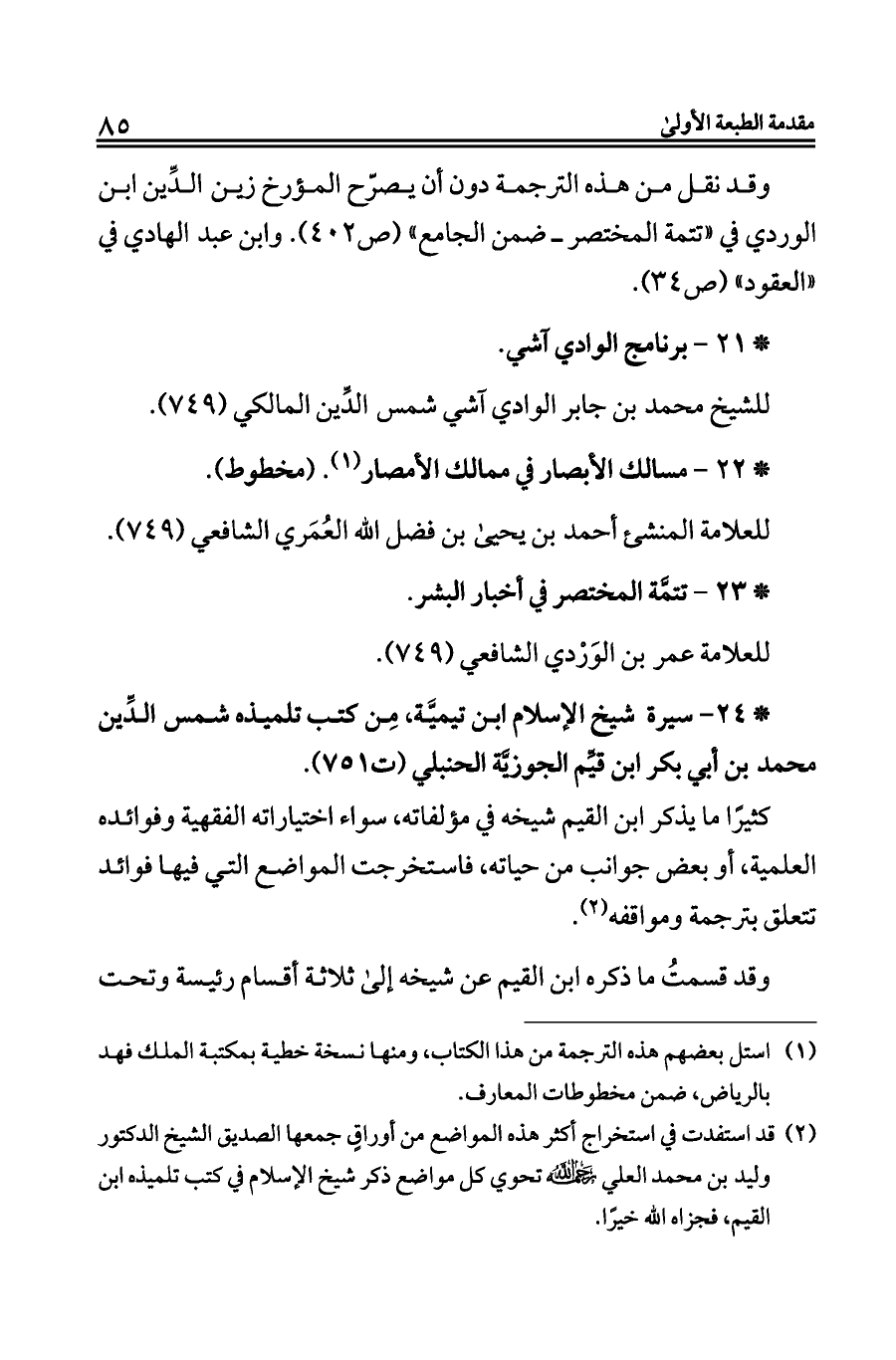 (¬٢) قد استفدت في استخراج أكثر هذه المواضع من أوراقٍ جمعها الصديق الشيخ الدكتور وليد بن محمد العلي - رحمه الله - تحوي كل مواضع ذكر شيخ الإسلام في كتب تلميذه ابن القيم، فجزاه الله خيرًا.