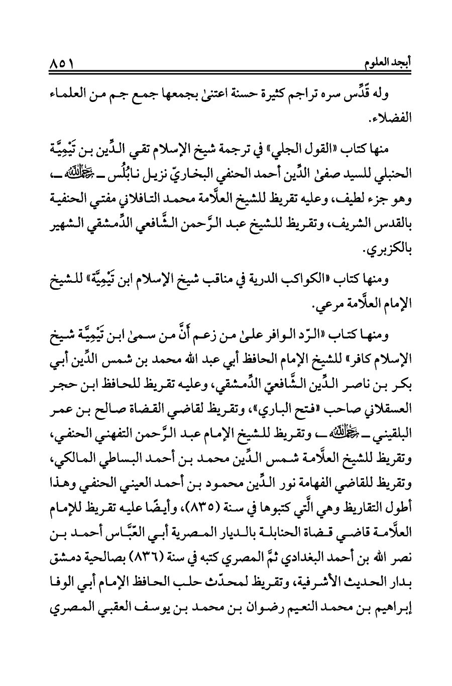 ومنها كتاب «الكواكب الدرية في مناقب شيخ الإسلام ابن تَيْمِيَّة» للشيخ الإمام العلَّامة مرعي.