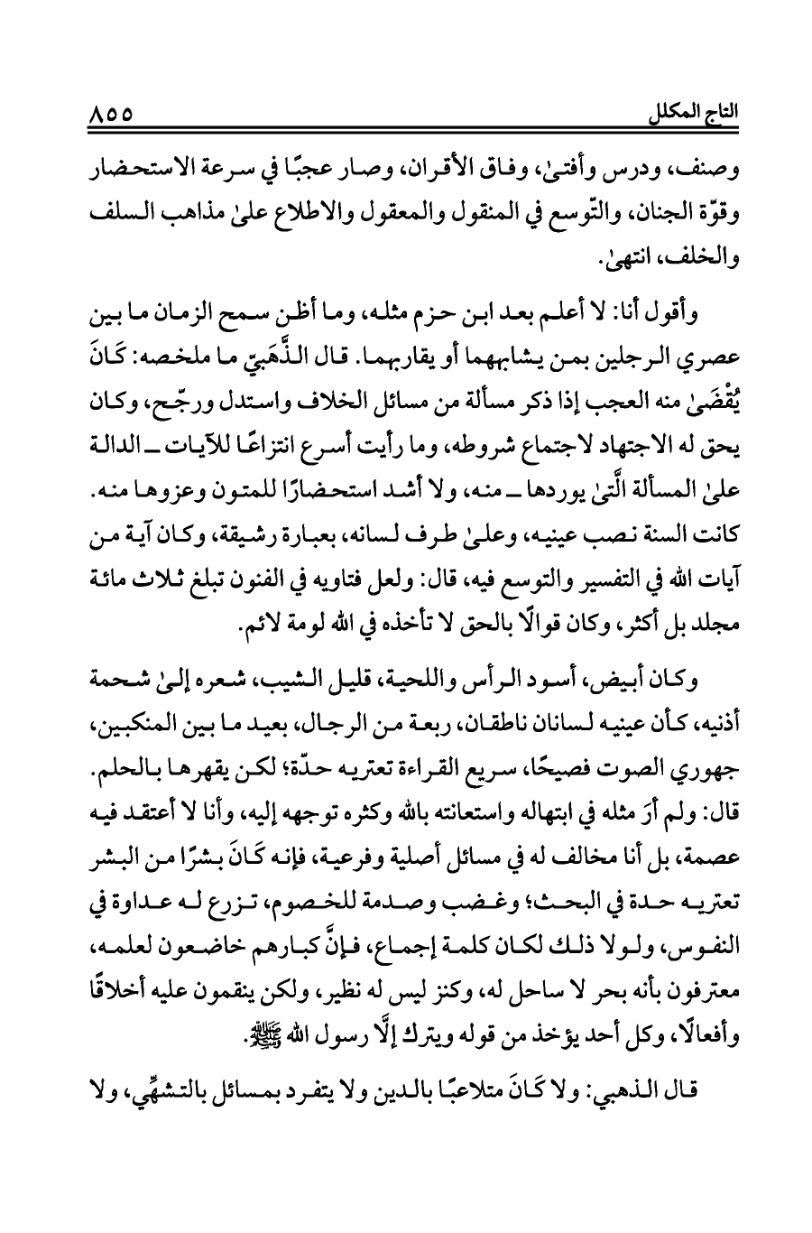وأقول أنا: لا أعلم بعد ابن حزم مثله، وما أظن سمح الزمان ما بين عصري الرجلين بمن يشابههما أو يقاربهما. قال الذَّهَبيّ ما ملخصه: كَانَ يُقْضَى منه العجب إذا ذكر مسألة من مسائل الخلاف واستدل ورجّح، وكان يحق له الاجتهاد لاجتماع شروطه، وما رأيت أسرع انتزاعًا للآيات ــ الدالة على المسألة الَّتى يوردها ــ منه، ولا أشد استحضارًا للمتون وعزوها منه. كانت السنة نصب عينيه، وعلى طرف لسانه، بعبارة رشيقة، وكان آية من آيات الله في التفسير والتوسع فيه، قال: ولعل فتاويه في الفنون تبلغ ثلاث مائة مجلد بل أكثر، وكان قوالًا بالحق لا تأخذه في الله لومة لائم.