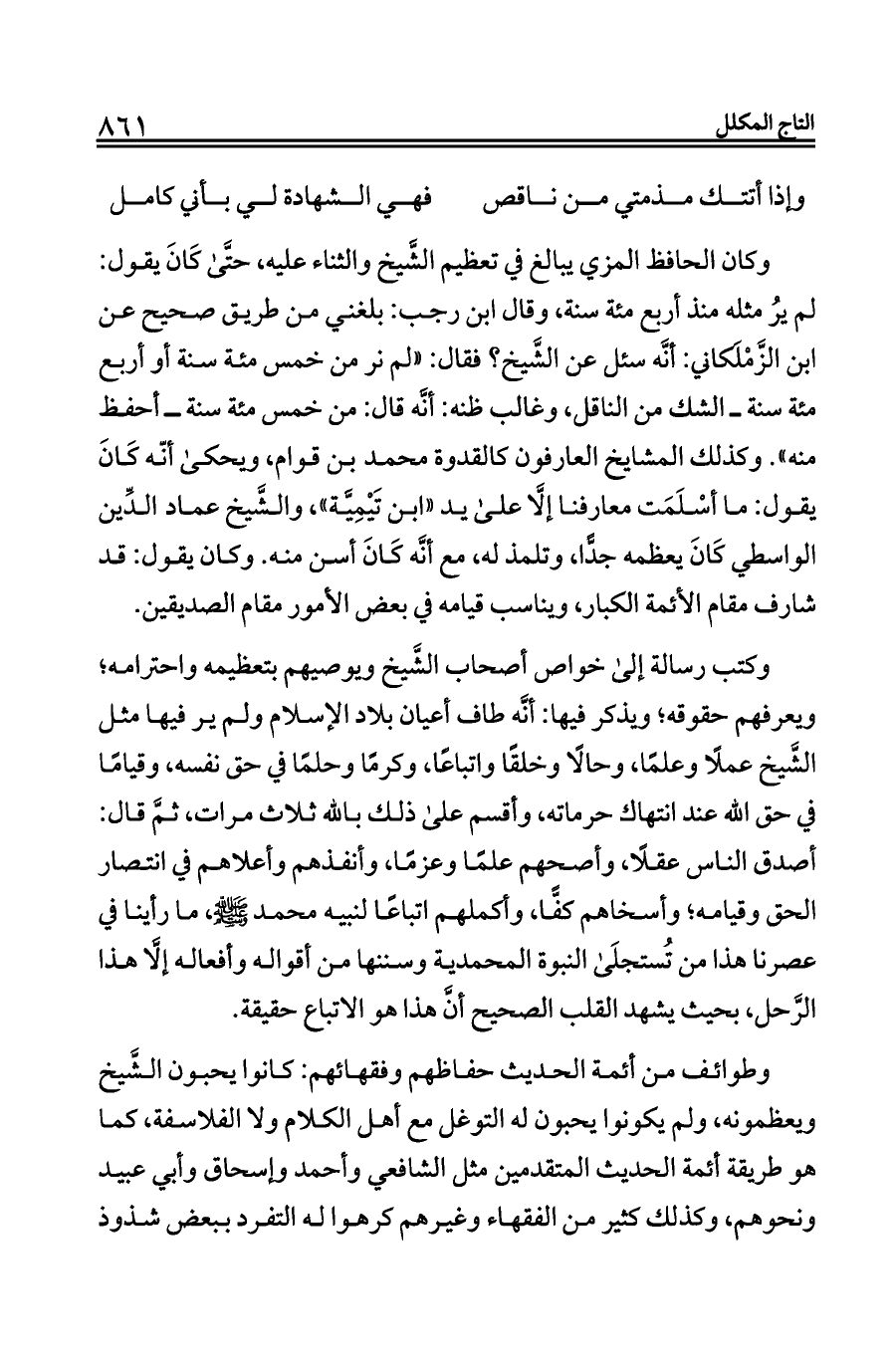 وكتب رسالة إلى خواص أصحاب الشَّيخ ويوصيهم بتعظيمه واحترامه؛ ويعرفهم حقوقه؛ ويذكر فيها: أنَّه طاف أعيان بلاد الإسلام ولم ير فيها مثل الشَّيخ عملًا وعلمًا، وحالًا وخلقًا واتباعًا، وكرمًا وحلمًا في حق نفسه، وقيامًا في حق الله عند انتهاك حرماته، وأقسم على ذلك بالله ثلاث مرات، ثمَّ قال: أصدق الناس عقلًا، وأصحهم علمًا وعزمًا، وأنفذهم وأعلاهم في انتصار الحق وقيامه؛ وأسخاهم كفًّا، وأكملهم اتباعًا لنبيه محمد - صلى الله عليه وسلم -، ما رأينا في عصرنا هذا من تُستجلَى النبوة المحمدية وسننها من أقواله وأفعاله إلَّا هذا الرَّحل، بحيث يشهد القلب الصحيح أنَّ هذا هو الاتباع حقيقة.